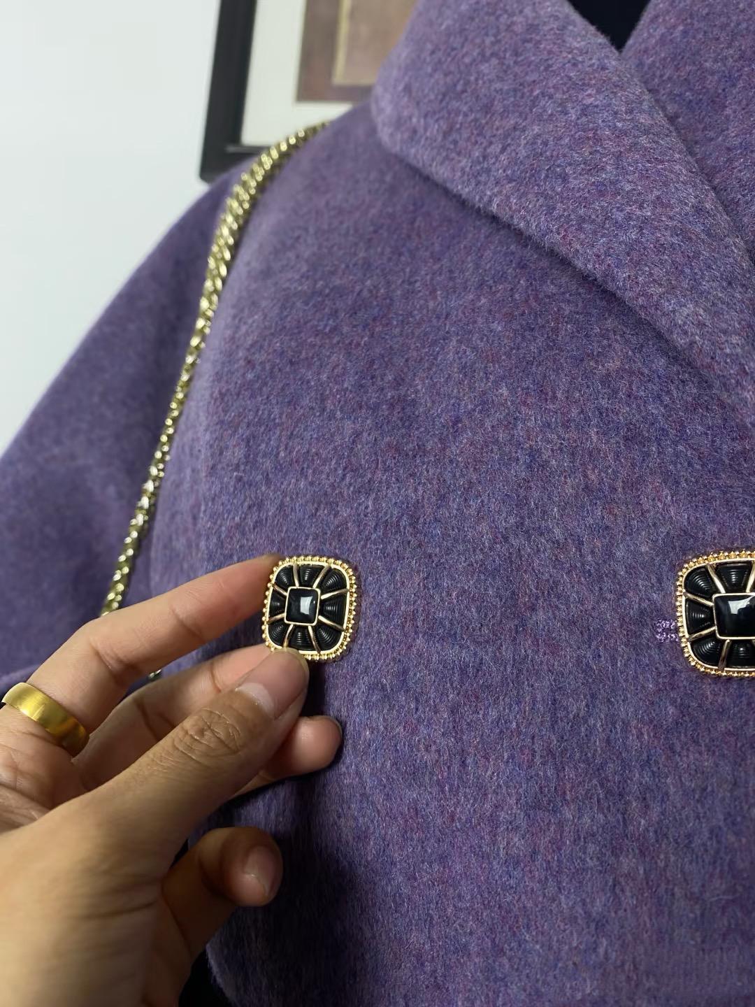 我買來了深紫色的毛呢面料,細密的毛呢摸着非常柔順暖和。就連紐扣也是精心挑選的,黑金配色的方形紐扣,也太好看了吧。