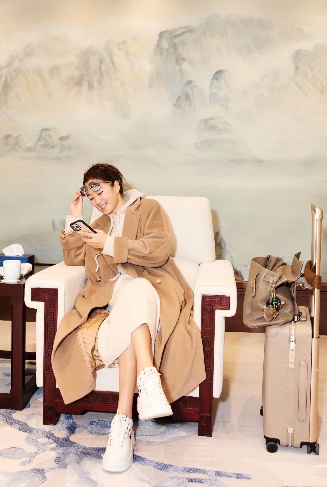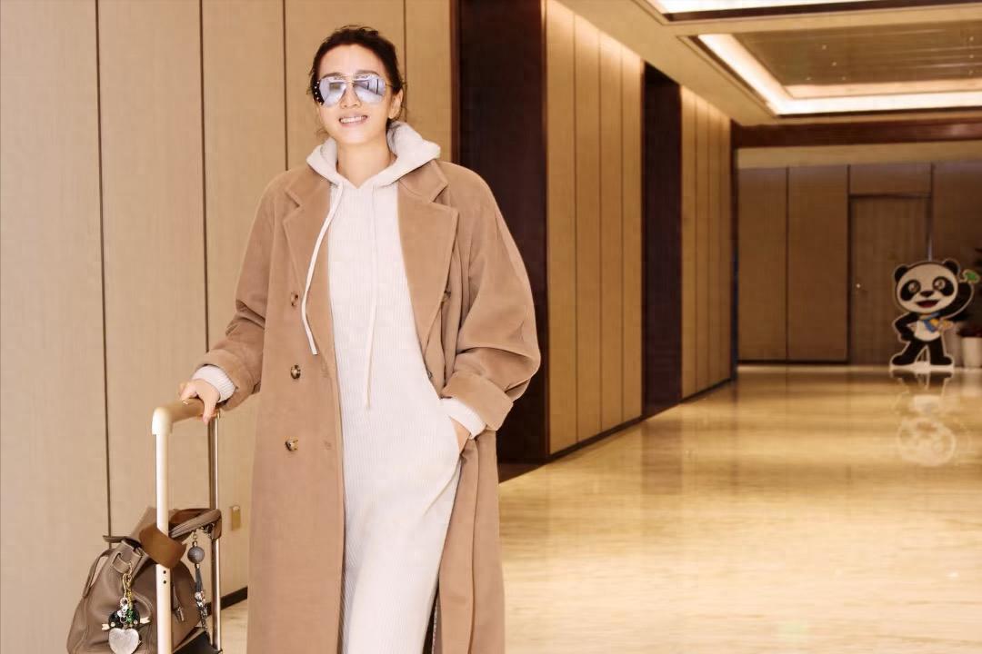 58歲鞏俐落地上海,穿駝色大衣配針織裙玩轉美拉德風,她好美好瘦