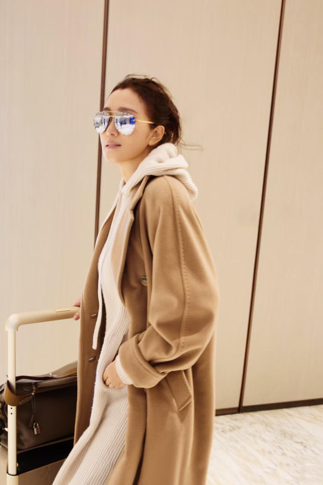 雖然駝色大衣帶一點小廓形的剪裁,但是修身的米杏色針織連衣裙自然包裹身體曲線,顯得她身材更加苗條,輕盈又唯美,非常顯年輕,看氣質還像小姑娘。