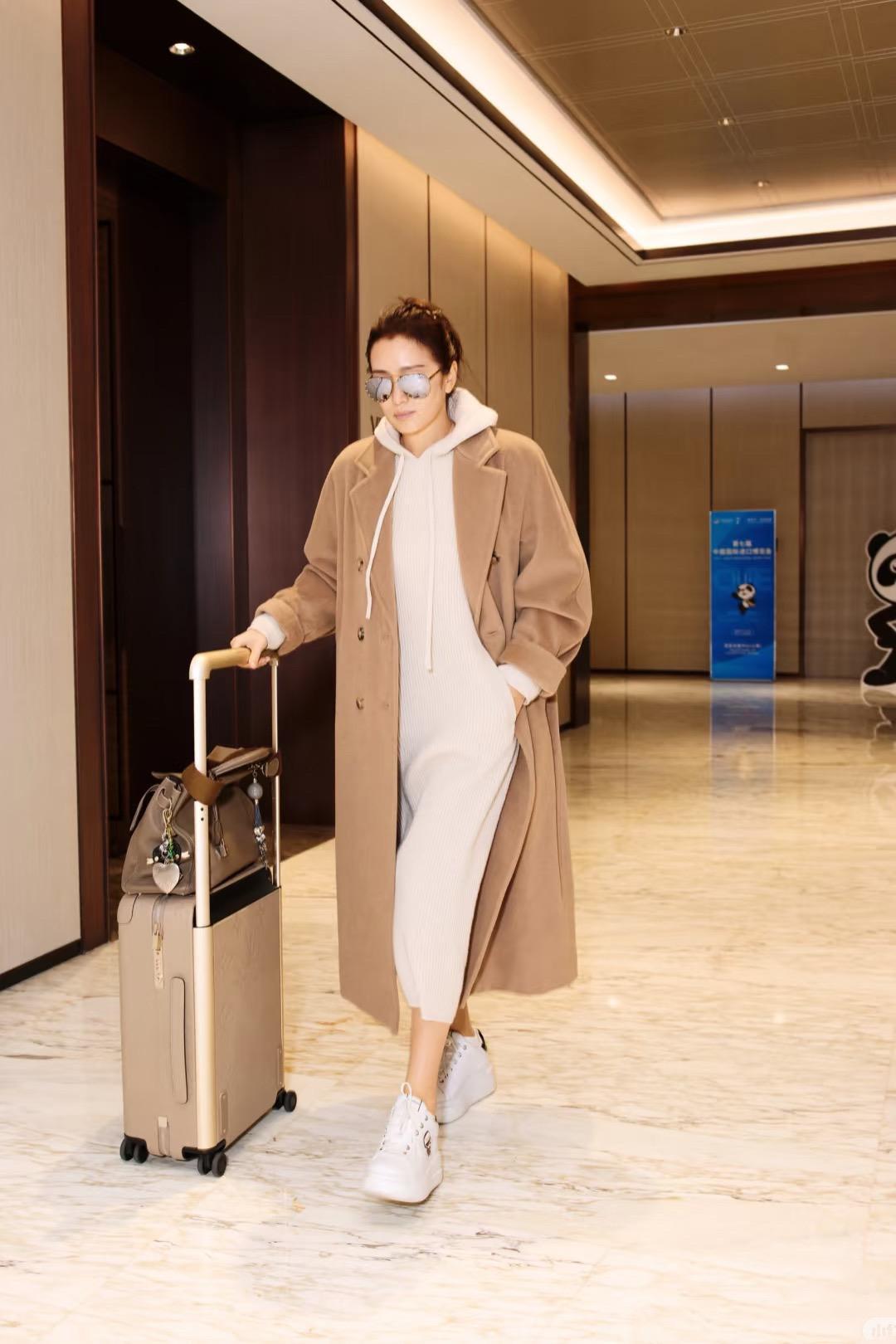 駝色大衣+針織連帽連衣裙+厚底的小白鞋,不僅顯得鞏俐個子更加高挑,露出腳踝位置的線條、也顯得她更加纖瘦苗條。