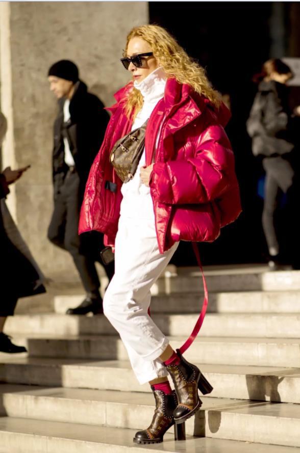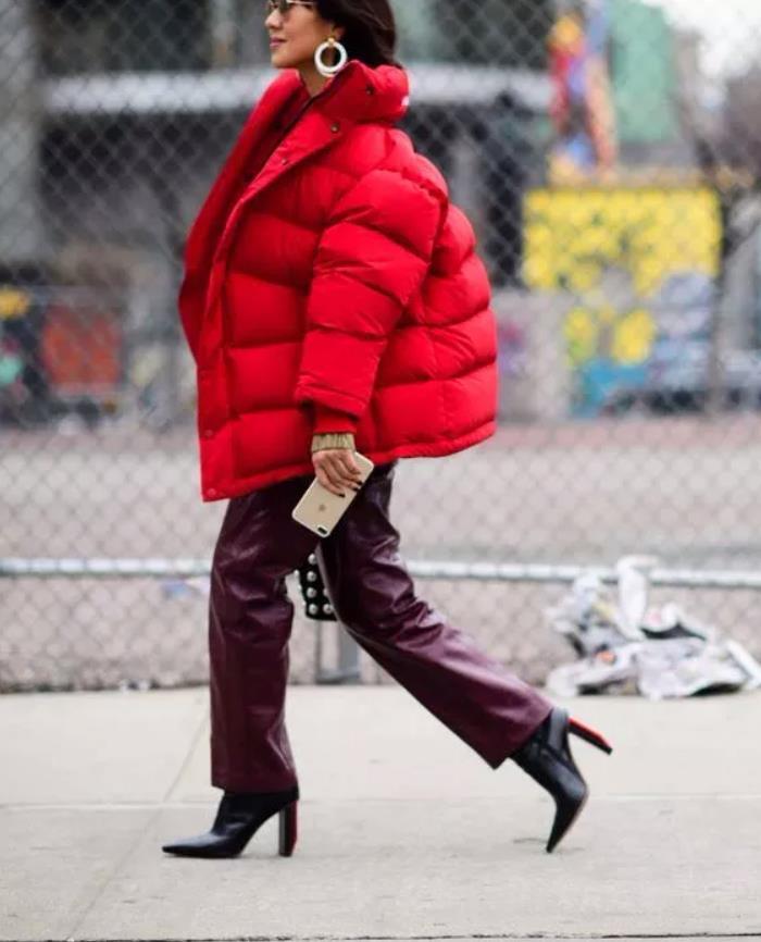 紅色短款羽絨服,真的太顯洋氣了,寬鬆的版型,對身材是一點違和感都沒有,搭配一條紫色皮褲,很好展現出女性的獨立和魅力,配上一雙黑色高跟鞋,就可以將屬於大女人的氣場展現出來,能瞬間變得帥氣有型。