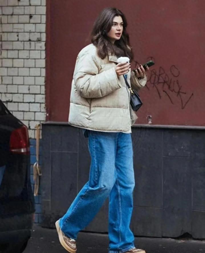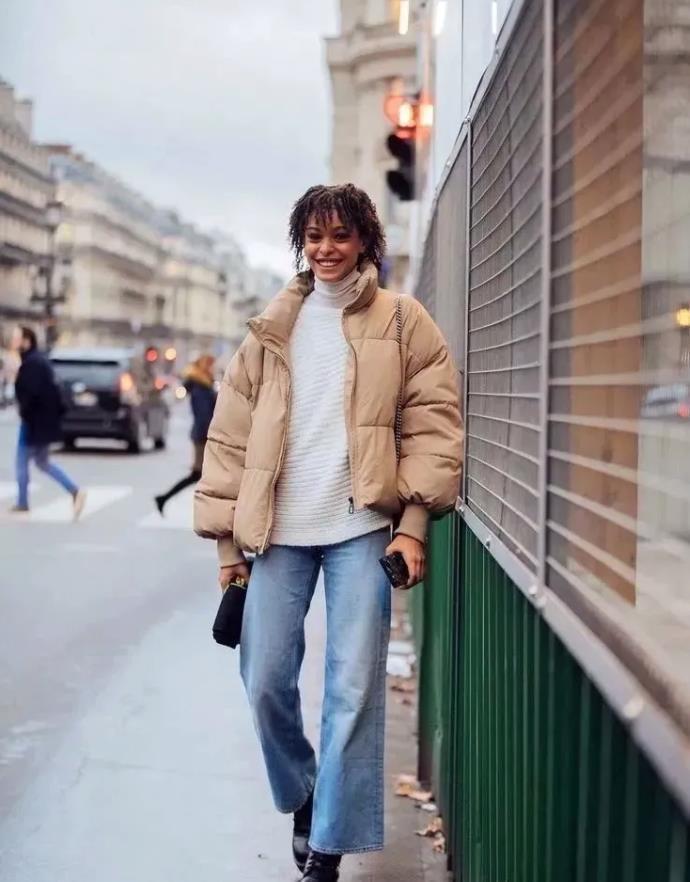 卡其色羽絨服,這個色調看起來也太氣質了,內搭一件白色高領打底衫,這兩種顏色組合一起很好看,輕鬆就能穿出精緻得體,搭配一條藍色牛仔闊腿褲,視覺上看起來也太顯瘦了,讓你毫不費力展現出鬆弛與隨性,選擇一雙黑色靴子,盡顯中性風。