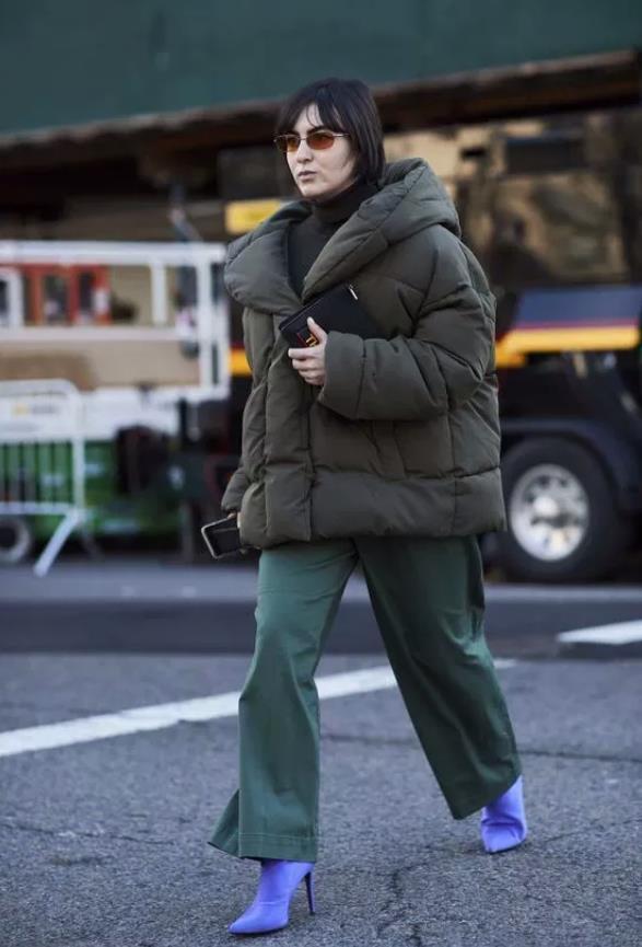 黑灰色的短羽絨服,顏色很耐看百搭,寬大的版型可藏肉顯瘦了,內搭一件黑色高領毛衣,這樣的穿搭看起來非常顯瘦。選擇一條綠色闊腿褲,就能釋放出獨特魅力了,又保暖又顯高級。