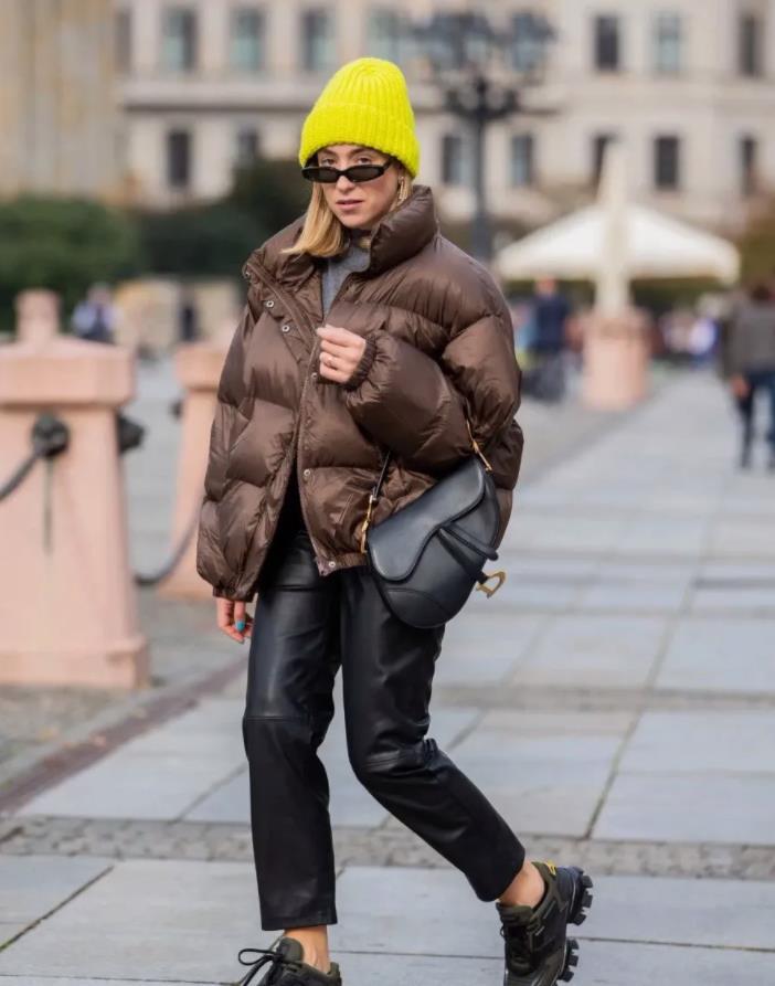 不知道你們有沒有覺得,咖色的短款羽絨服,真的很適合秋冬季節的,內搭一件灰色針織打底,一點違和感都沒有,任何女人都能穿出獨一無二的氣質,也不失隨性。搭配一條黑色真皮闊腿褲,可以讓你感覺到舒適顯瘦,配一雙運動鞋,灑脫隨性還不失氣質。