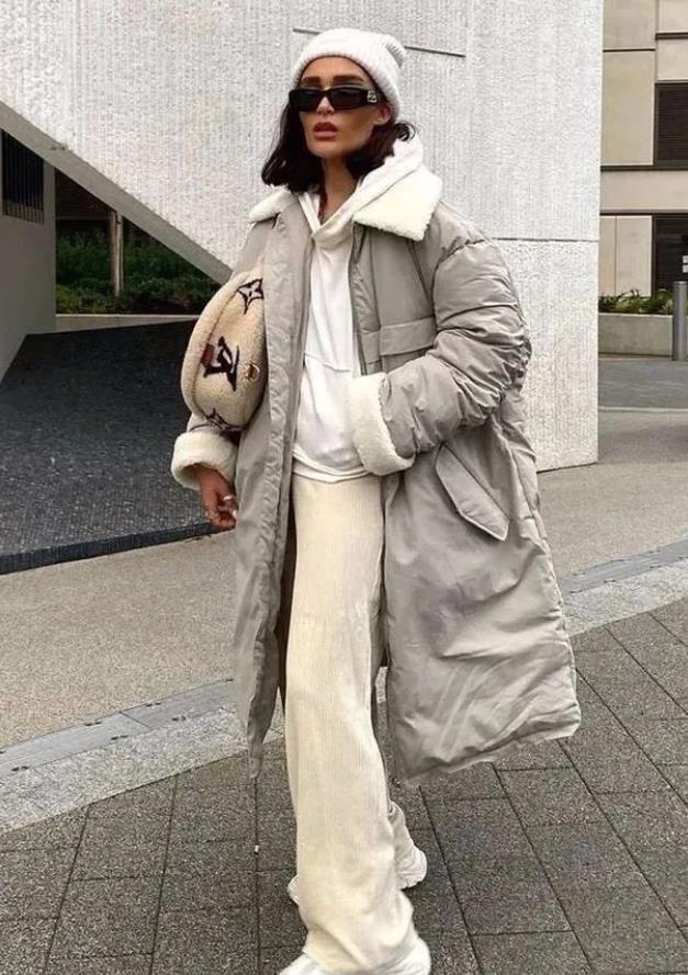 淺灰色長款羽絨服,這種長款外套,敞開穿就非常有範,內搭一件白色連帽衛衣,盡顯青春與活力,搭配上一條白色絨闊腿褲,穿起來可太顯瘦了,也很溫暖。搭配起一雙白色運動鞋吧,很好穿出一種隨性自在,最重要是還不失大方。