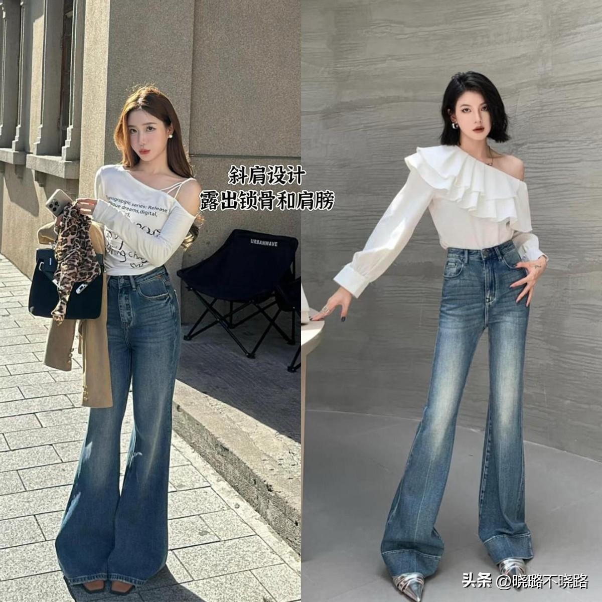 斜肩上衣在視覺上很有吸引力,而且還能打破常規化,和高腰牛仔微喇褲堪稱絕配,最後,再踩上一雙低跟鞋,秒變大長腿。