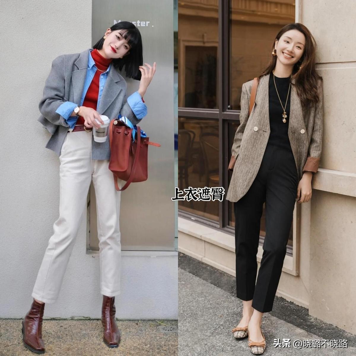 遮臀上衣的挑選十分豐富,比如西裝、毛衣、衛衣或者針織開衫等等,和九分煙管褲進行組合,都是很合拍的。