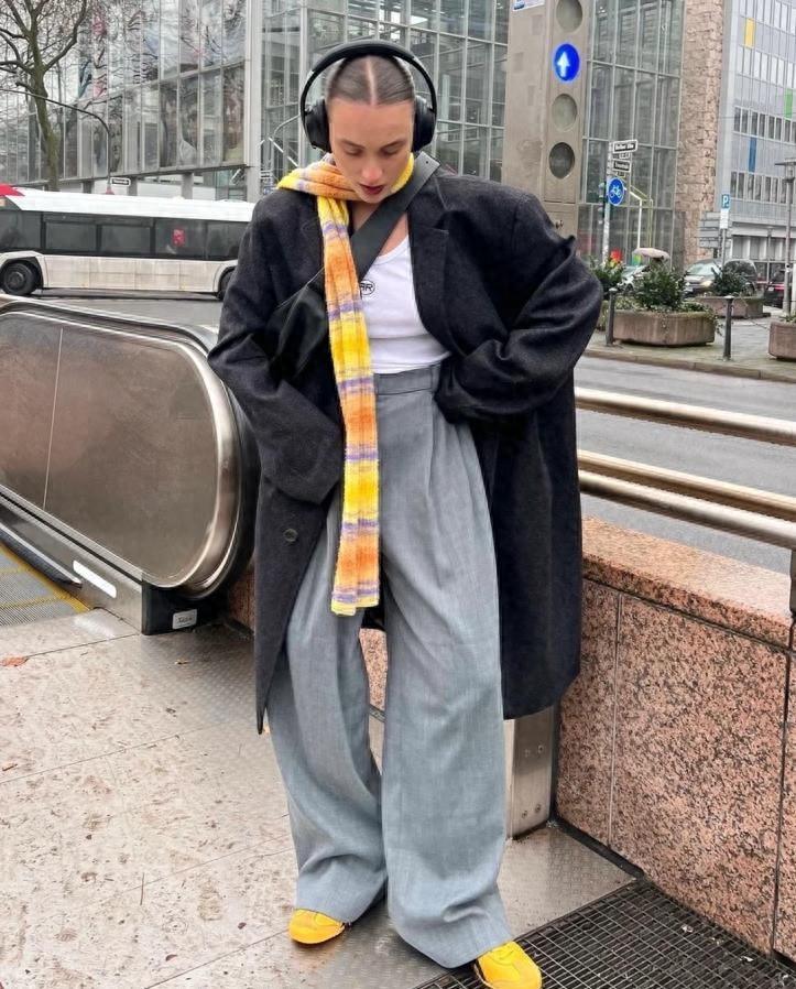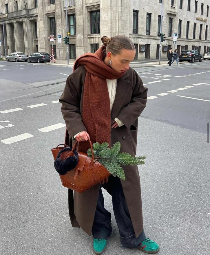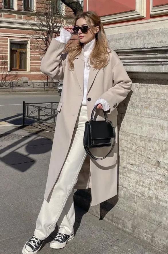 這個顏色的大衣真的很顯氣質呢,內搭一件白色高領針織打底衫,很好營造出一種大氣感,毫不費力就能實現剛柔並濟,搭配一條白色牛仔闊腿褲,再加上一雙帆布鞋,又穿出舒適自在,瀟灑又帶着氣場。