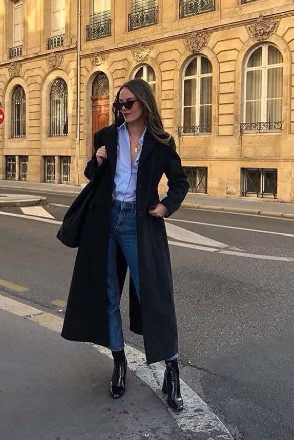 黑色大衣+藍色襯衫,剛柔並存,很好將個人氣質感盡顯出來,也營造出屬於女人的精緻很帥氣,搭配一件藍色牛仔褲,能輕鬆hold住全場,很減齡顯年輕。搭配上一雙高跟長靴,就毫不費力穿出高級和有範了。