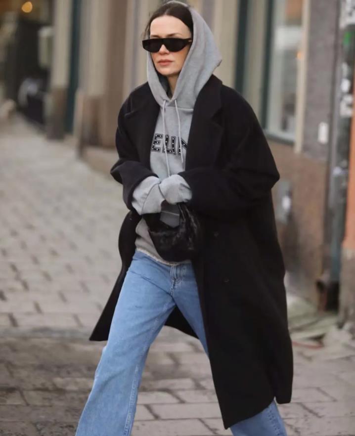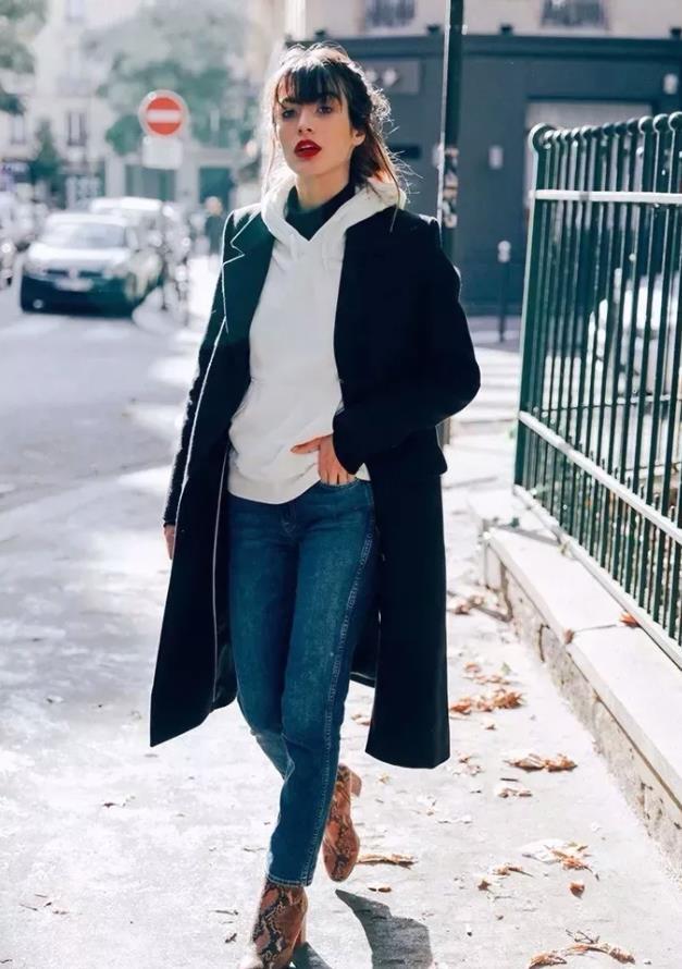 黑色的長大衣,那可是最耐看不挑人的了,很簡約高級的款式,怎麼搭配都不會出錯,內搭選擇一件白色連帽衛衣,裏面還疊穿一件打底,很好保證了穿着溫度。也強調了女性的魅力,下裝搭配一條藍色牛仔褲,整個着裝看起來又冷又颯,帶着幾分隨性和優雅。