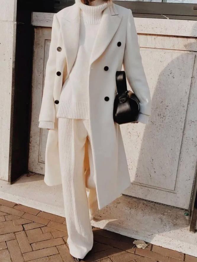 如果你覺得黑色大衣穿起來太顯沉悶的話,那麼就試試這一件白色大衣,雙面的款式設計,質感是非常不錯的,內搭一件白色高領打底衫,很好綻放出女性魅力。毫不費力就穿出了簡單不平凡的效果,再搭配一條白色闊腿褲,很休閒也大氣,腳上踩着一雙黑色高跟鞋,瞬間顯得高挑和灑脫。