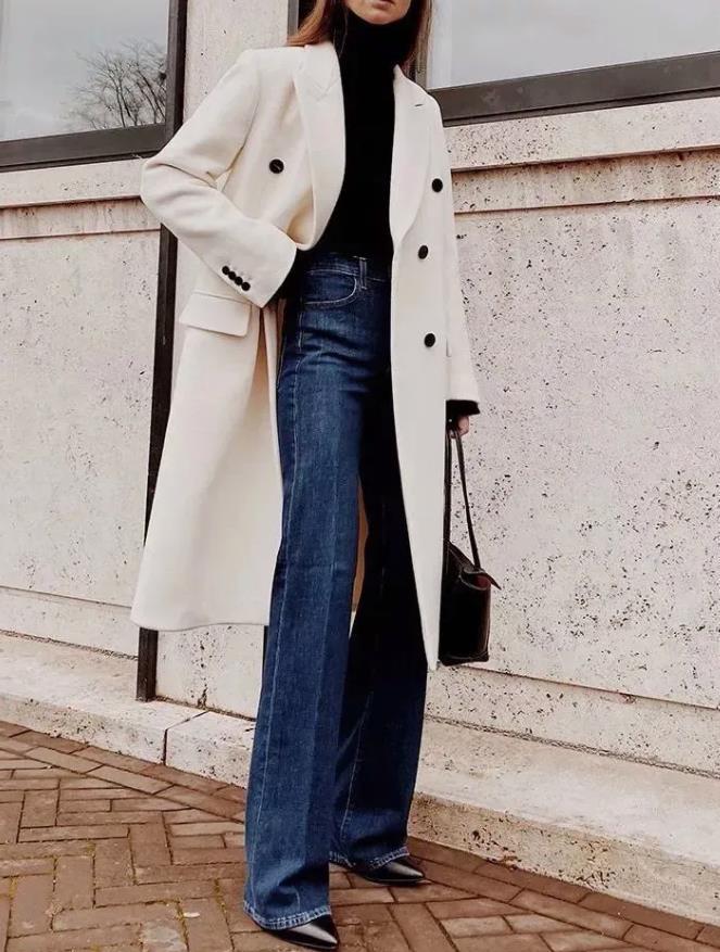真的很喜歡這種高級奶白色雙面大衣,質感可是非常不錯的,寬鬆的大衣版型,最藏肉顯瘦了,內搭選擇一件黑色高領打底,黑白配,可時髦高級了。搭配上一條藍色牛仔褲,就又爲整個着裝增添了幾分魅力和年輕氣息,配上一雙黑色平底鞋,舒適自在又大方。