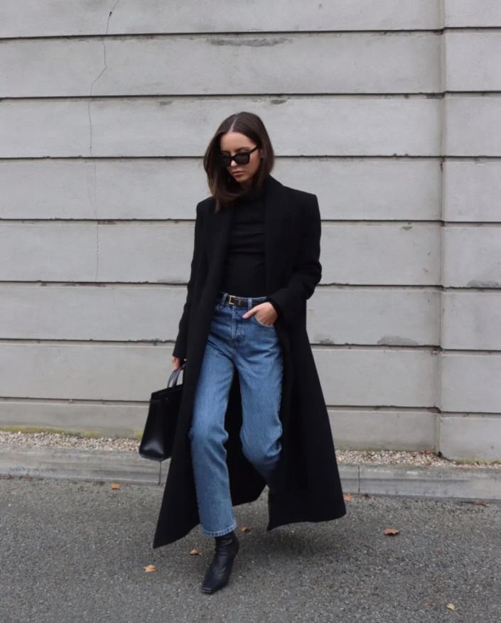 經典黑色大衣,沒有比這個顏色更百搭耐看的了,雙面的款式,質感是不在話下的,內搭一條黑色針織打底衫,視覺上很瘦身,這麼穿也能讓人感受到輕鬆和自在。搭配一條藍色牛仔褲,黑+牛仔藍的配色,也太高級顯年輕了,腳下踩着一雙黑色靴子,不僅顯隨性又時髦。