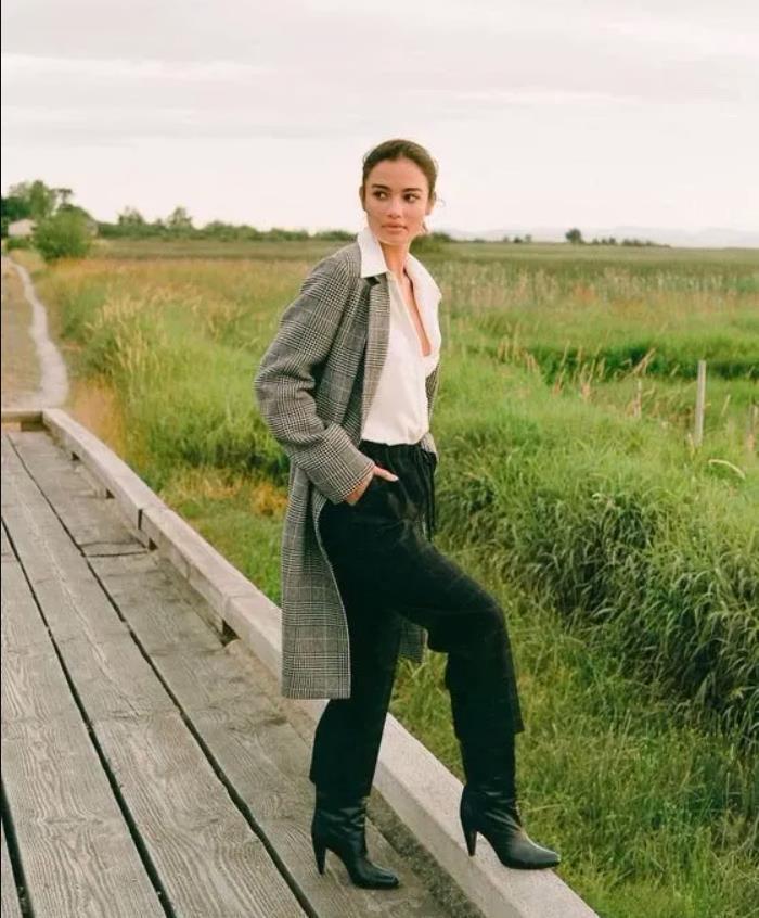 格紋雙面大衣,這件大衣是很容易穿出復古氣息的,內搭選擇一件白色襯衫,遵循了簡繁組合,輕鬆打造出層次感,可以將氣質和內涵都發揮出來,也不失女性的鬆弛和大方,搭配一雙黑色高跟鞋,盡顯大女人的自信獨立。