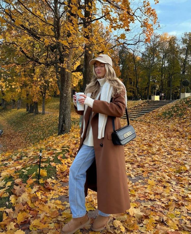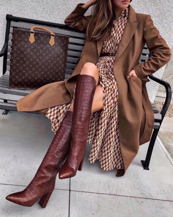 這種咖色的雙面大衣,是真的很帶氛圍感呢,質感也非常不錯,內搭一件襯衫印花連衣裙,顯女人味的同時,又透露着幾分高級與大氣。可以將女性的帥氣和魅力都盡顯出來,搭配一雙紫色長靴,就能在視覺上盡顯出幹練和氣質,營造出大女人風的效果。