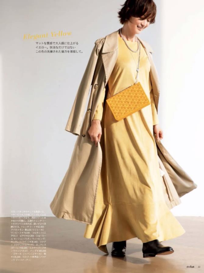 卡其色的風衣,就是最顯氣質的,也能打造出個人高級範,就這麼披在身上,可太顯氣場了,內搭一條黃色連衣裙,很好穿出了簡約又不失華麗的氣場,搭配一雙黑色平底鞋,整個人都透着休閒大氣,也頗顯個人態度。