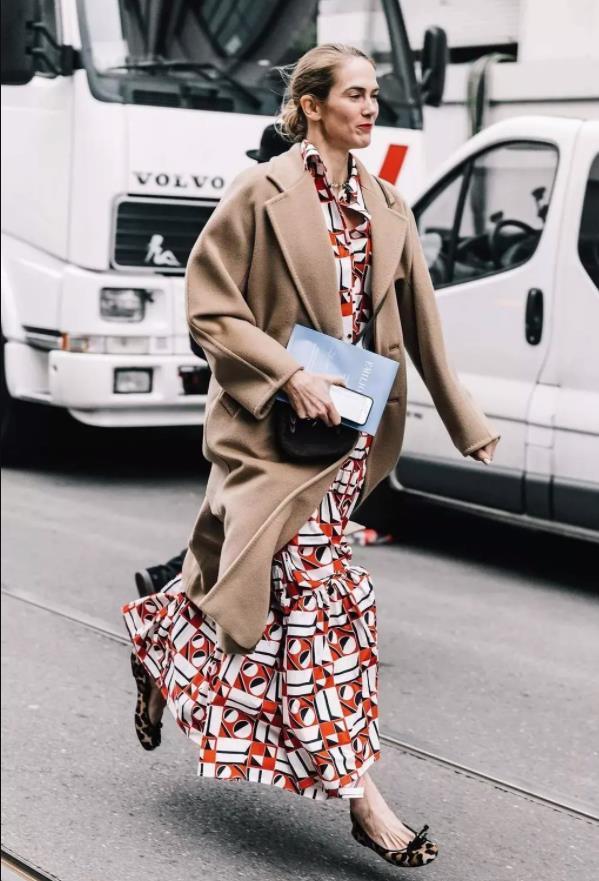 卡其色的雙面大衣,這個色調就是很不失氣質,寬大的版型,最藏肉顯瘦了,內搭一件印花襯衫連衣裙,遵循了簡繁組合,營造出灑脫氣質感,看似簡單的搭配,實際上卻很時尚,選擇一雙平底鞋來配,就表達出自信和高級感。