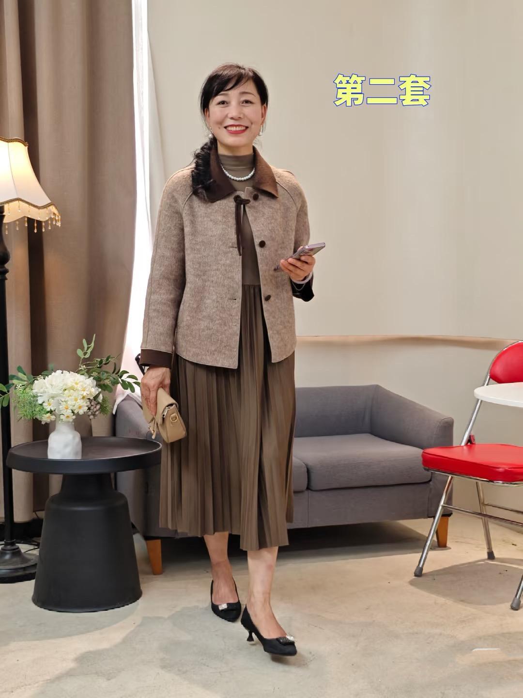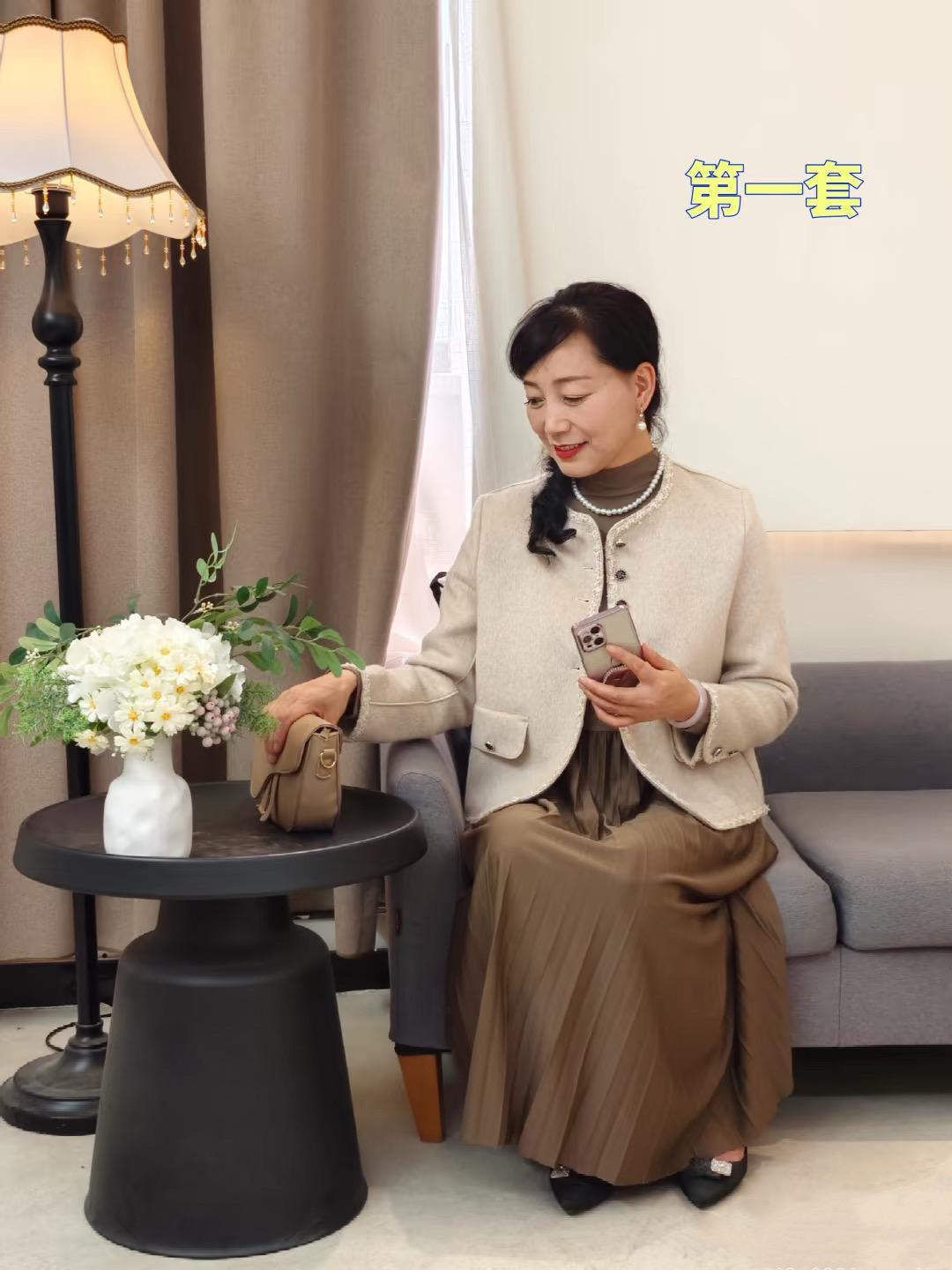 第一套:米白色小香風外套+棕色打底衫+百褶裙