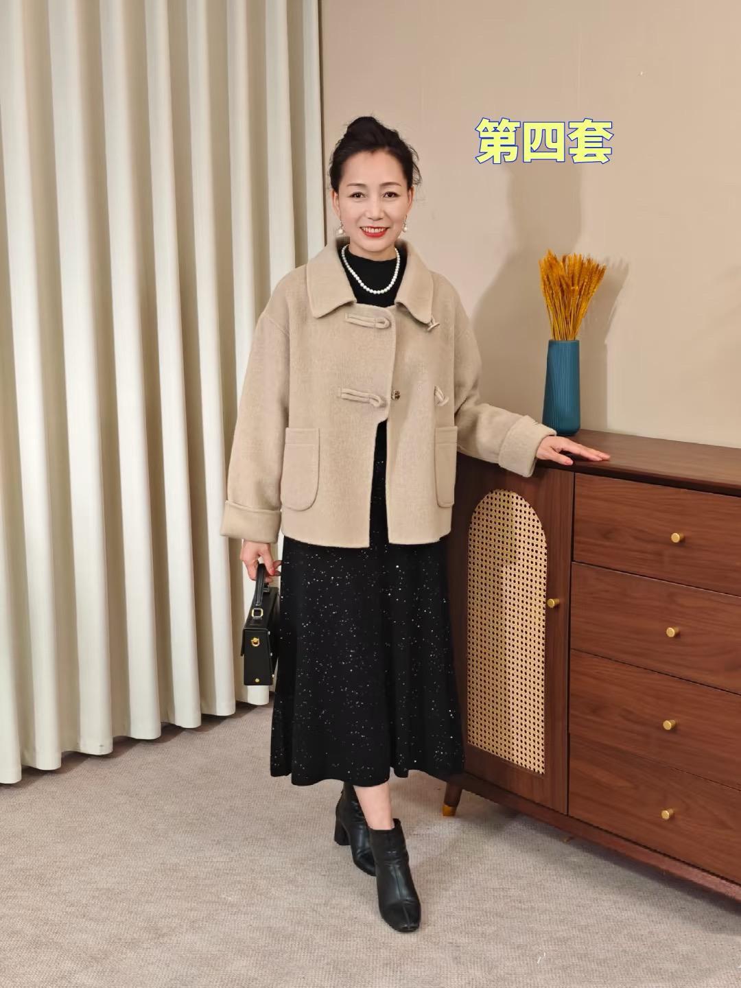 燕麥色的毛呢外套,一種過腰遮胯的長度,就特別大氣。其實像媽媽這個年紀,外套就沒有必要選擇短款了,過腰的長度更利落、也更顯瘦。