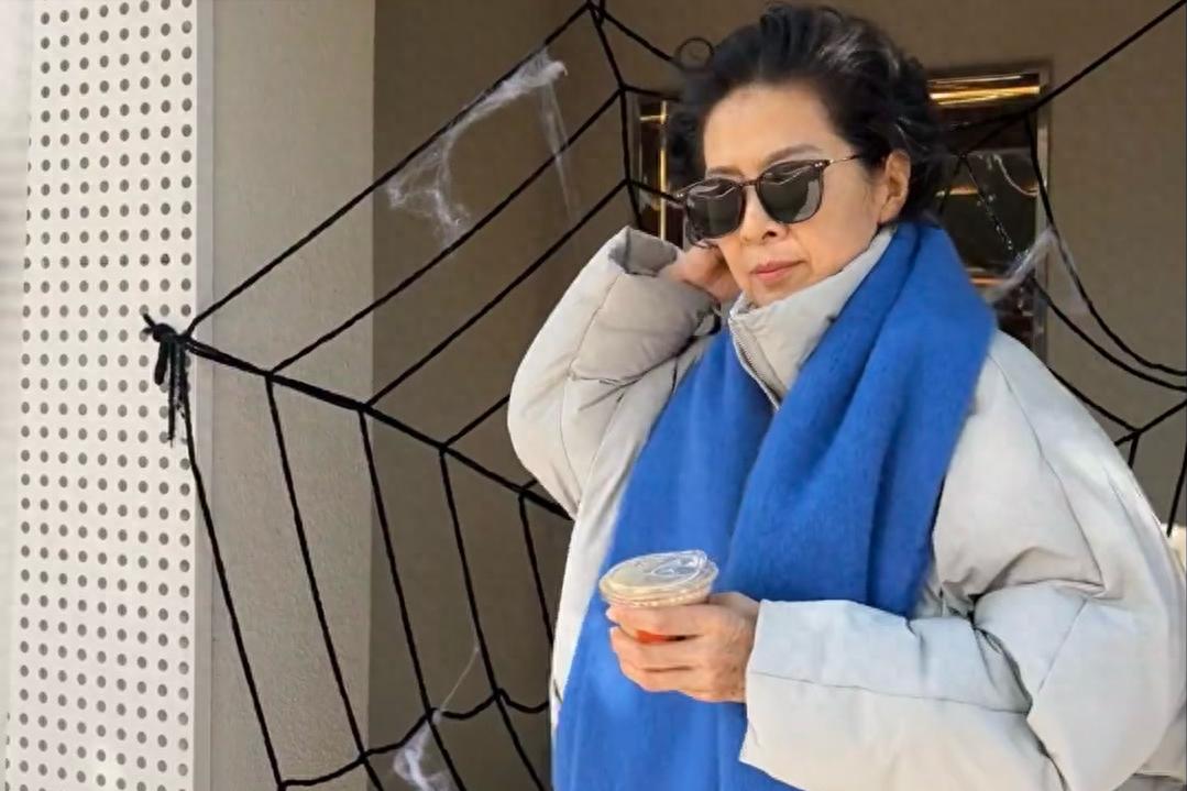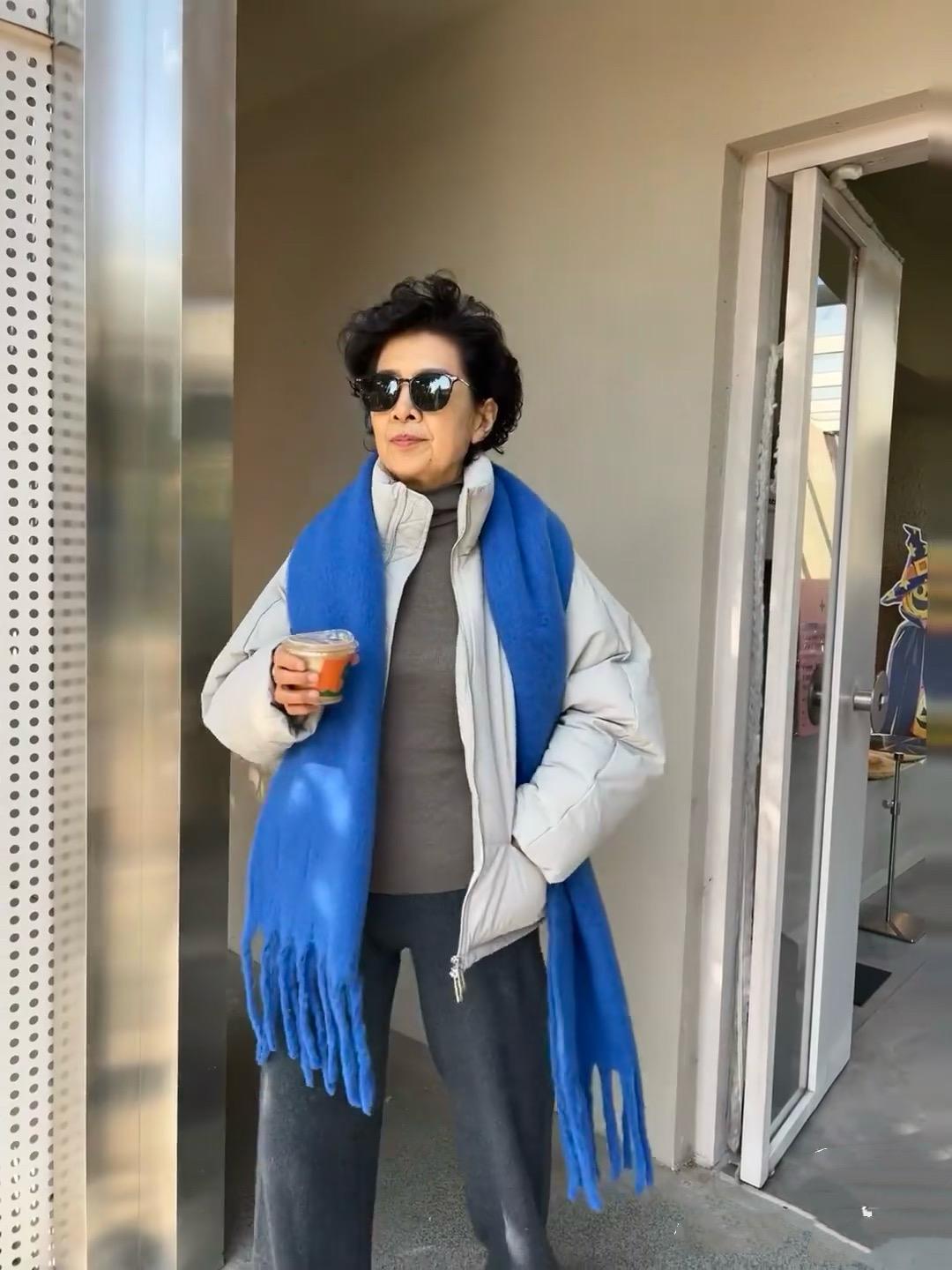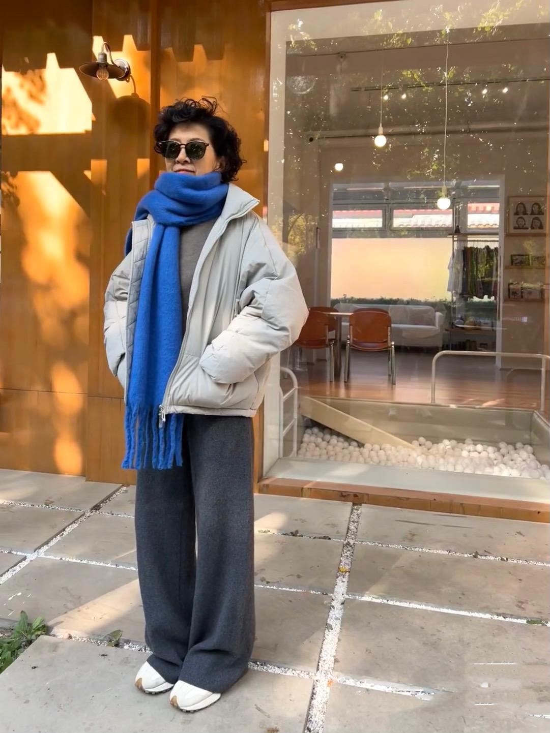 62歲老阿姨,穿一身灰配克萊因藍圍巾,是不是大方又減齡?