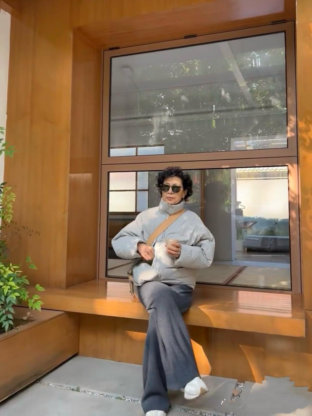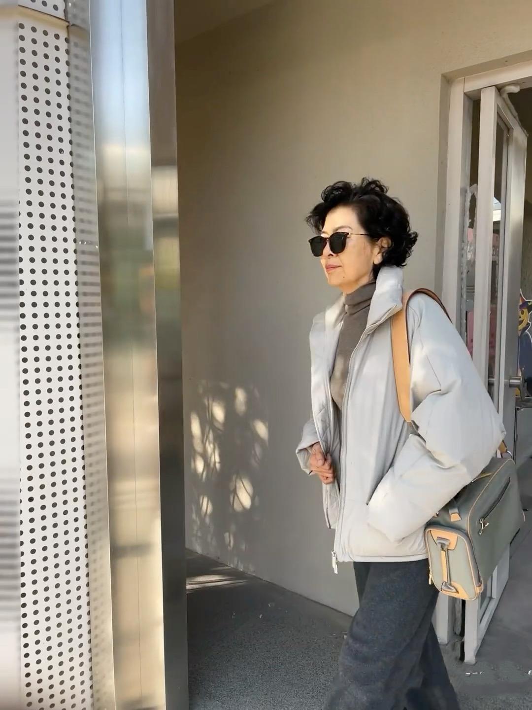 淺灰色的羽絨服,我搭配了一條深灰色毛呢褲。年紀大了,比不了年輕人,身體機能都在下降,所以穿衣服還是要更厚實一些。