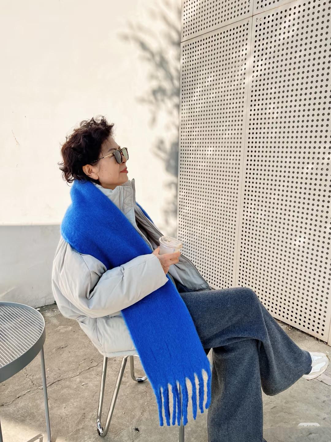 初冬的天氣,已經有點冷了。穿上羽絨服的時候,我就想到了要搭配亮色圍巾。這條克萊因藍的圍巾正合我意,很明亮、也很顯白,看着比較顯年輕。