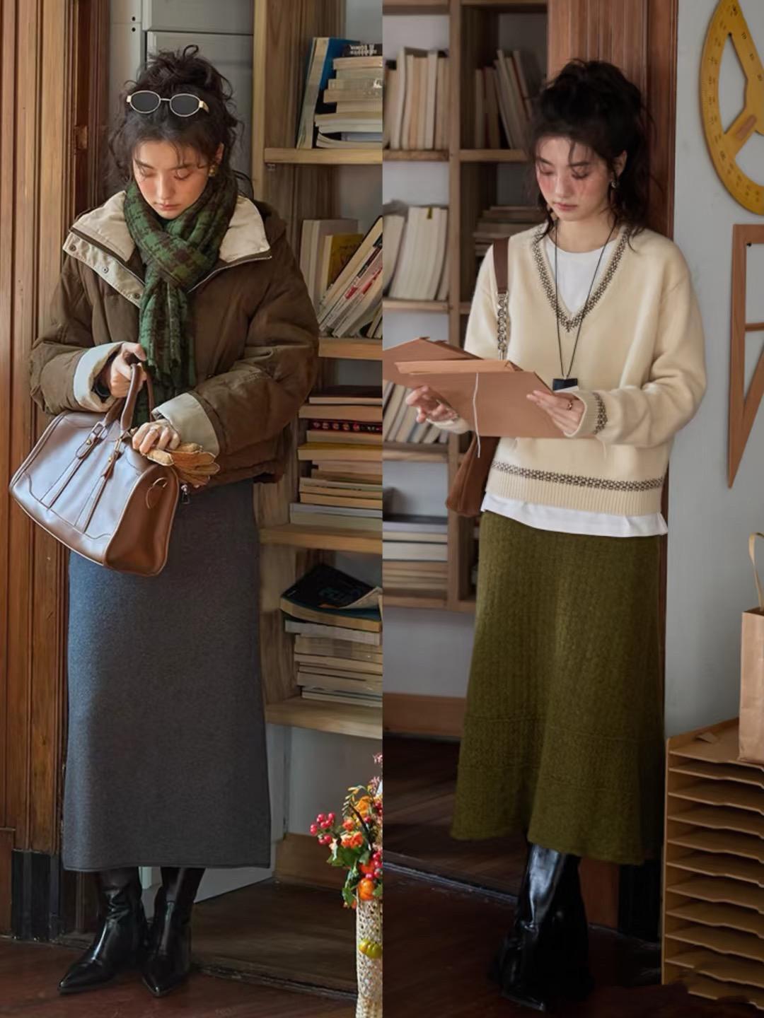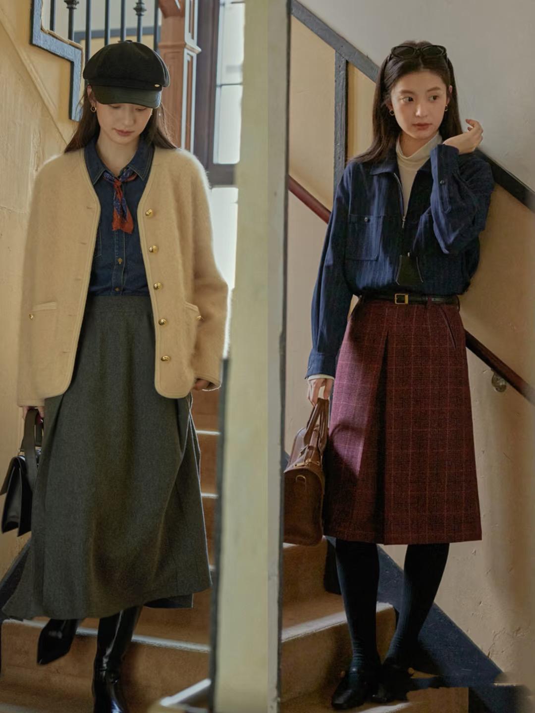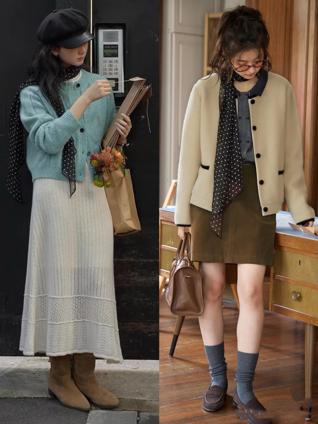 復古感的面料,沒有太多的科技感,自然就更符合知識分子風穿搭的品味需求。比如羊毛針織裙、毛呢半身裙,穿起來都保暖又有腔調。