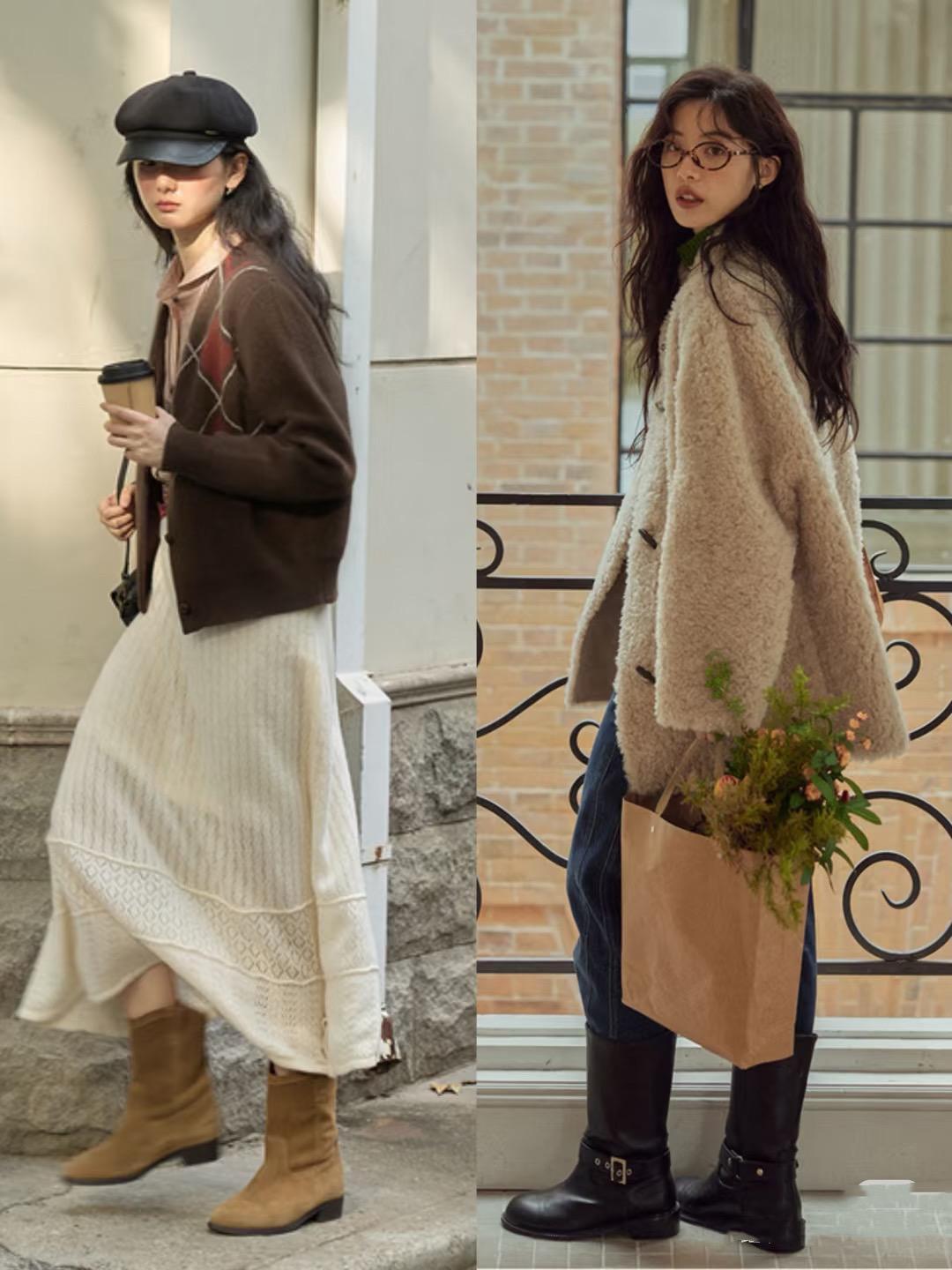 尤其是短靴與針織開衫、襯衫選擇了同色系,毛線裙作爲過渡點綴,顯得下肢比例更優越。其實深秋季節的棕色短靴,隨便配就很洋氣。