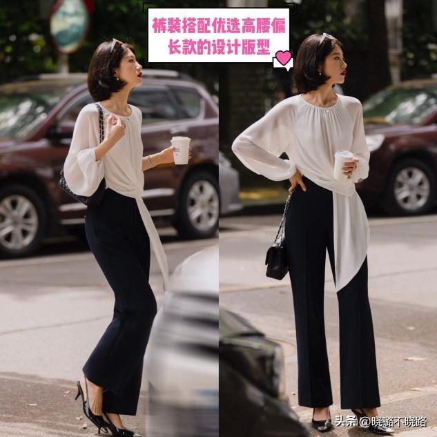 不管你選擇的褲裝褲管是什麼樣的寬度,最好能夠使其線條保證h版型的狀態穿起來的時候與所選擇的上衣它完全是線條同頻的效果,這樣的穿搭真的是顯瘦又顯非常具有美感的曲線走向。