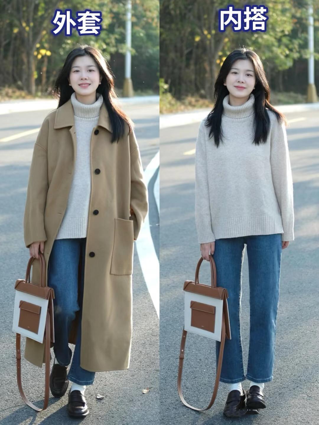 這種燕麥色的高領毛衣,一種素雅的配色非常溫柔、也很顯氣質。用燕麥色高領毛衣搭配直筒的牛仔褲,簡單又耐看。外出披一件毛呢大衣,上班也很顯氣質。