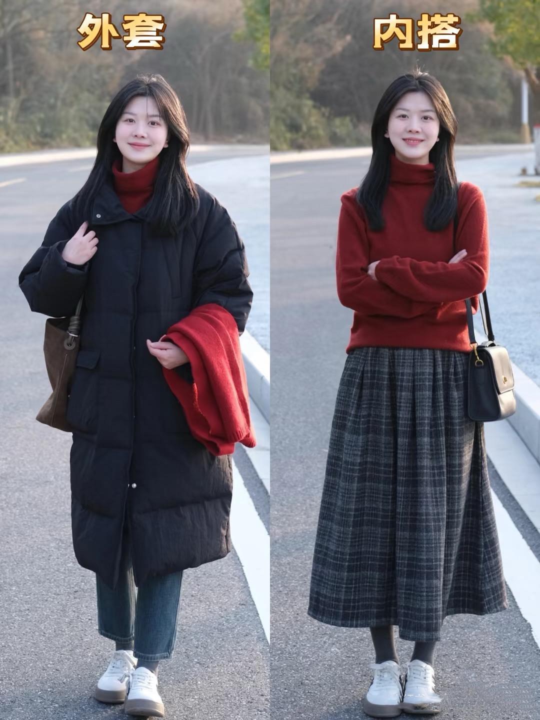 高領的紅色毛衣,亮度不是很高,穿起來超級顯白。配上格子半身裙,有一種文藝又減齡的美。這種格子半身裙配紅毛衣也很有氛圍感,天冷搭配寬鬆羽絨服就可以啦。