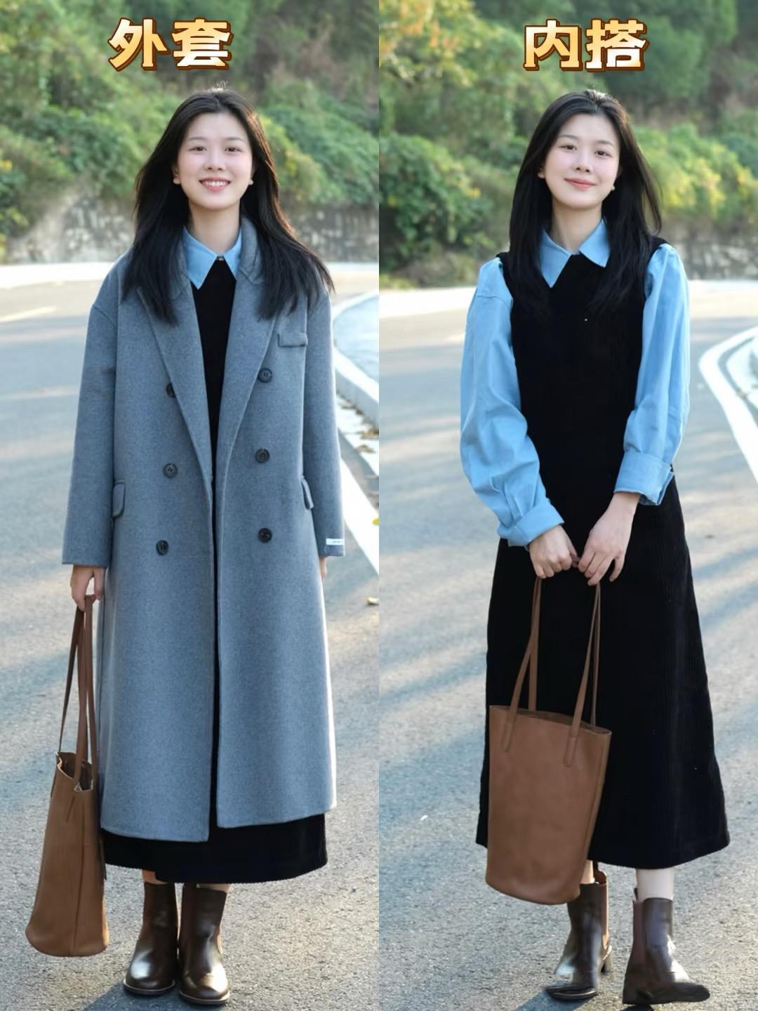 初冬時節的黑色背心裙,與藍色襯衫也是絕配。如果穿了藍色襯衫,就搭配霧霾藍的大衣吧。藍配黑色很高級,也很醒目。背心裙配小短靴,也是超有範。