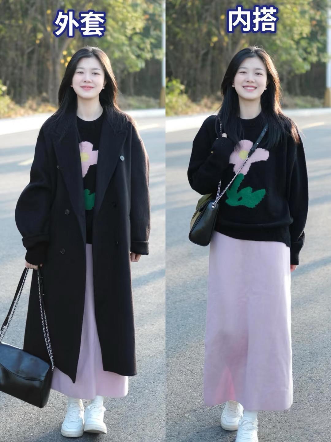 一件黑色大衣,繭型的款式更顯大氣之美。黑色大衣+慵懶風毛衣+半身裙+小白鞋,帶着少女的青春與羞澀,展現出獨特的溫柔和靜美。