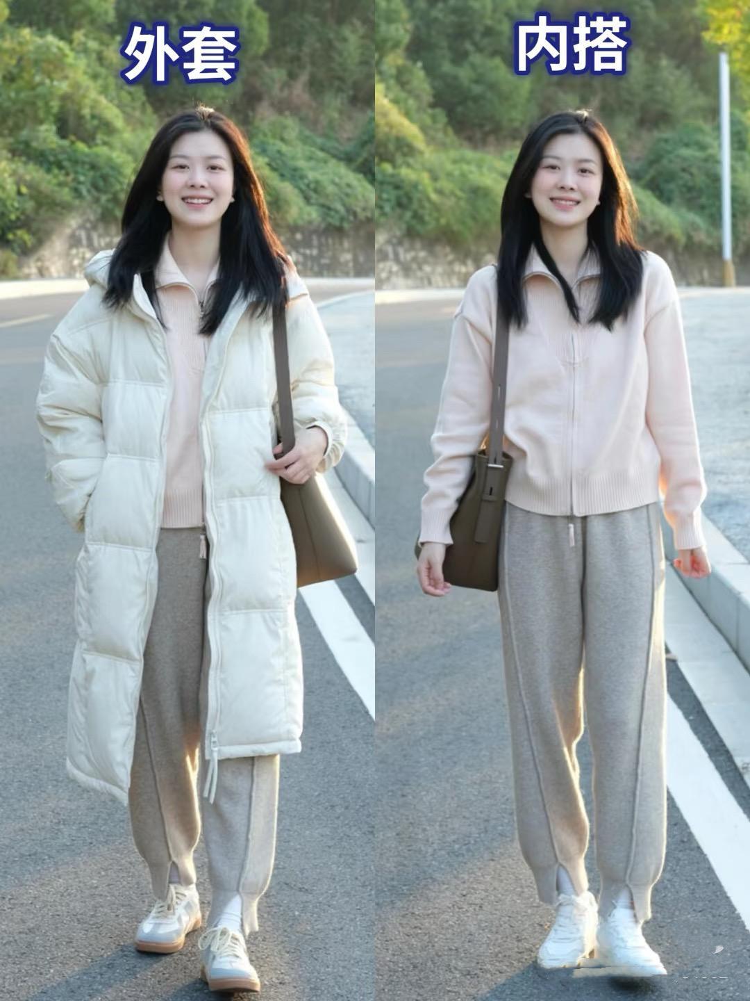 裸粉色的拉鍊毛衣,特別的文靜柔和。這種肉桂色,真的超顯氣質。對於40+女生來講,是一個更好的選擇。搭配白色長款羽絨服,溫柔又保暖。