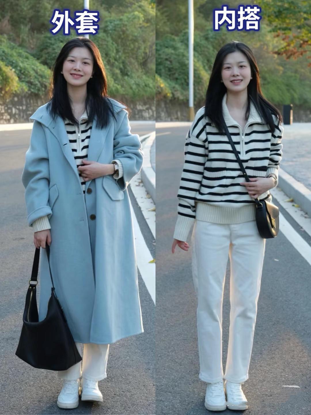 半拉鍊的條紋毛衣搭配直筒小白褲,是一種帶着青春氛圍的穿搭。不管是日常休閒、還是通勤上班,都比較顯氣質。