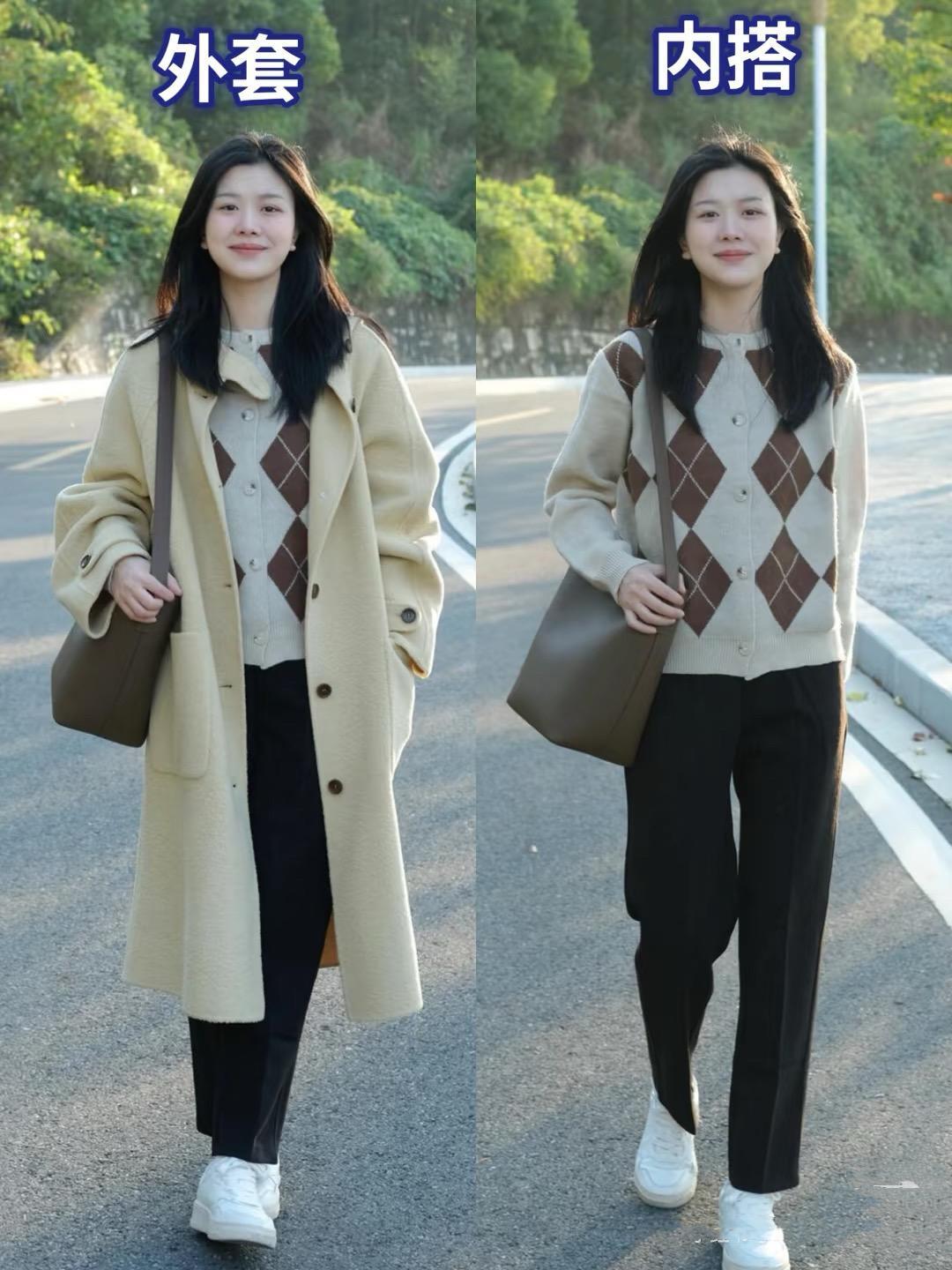 這種菱格的毛衣,配一條嚴管小黑褲,簡單又別緻。像這種菱格毛衣,配上鵝黃色的毛呢大衣,也是超溫柔、特別顯氣質。