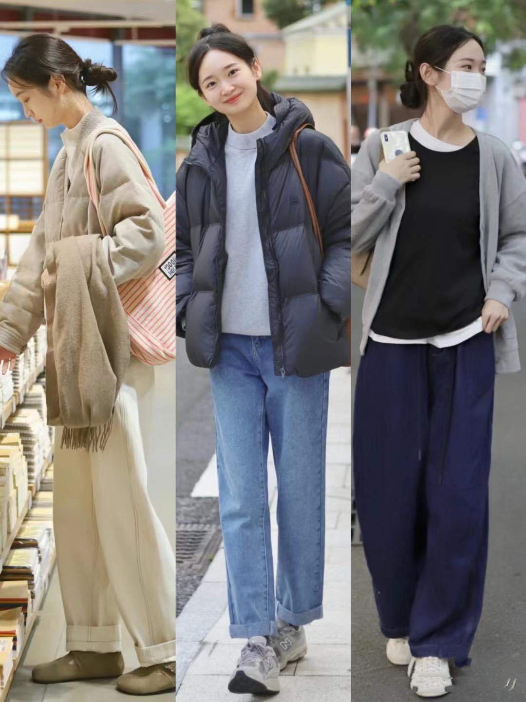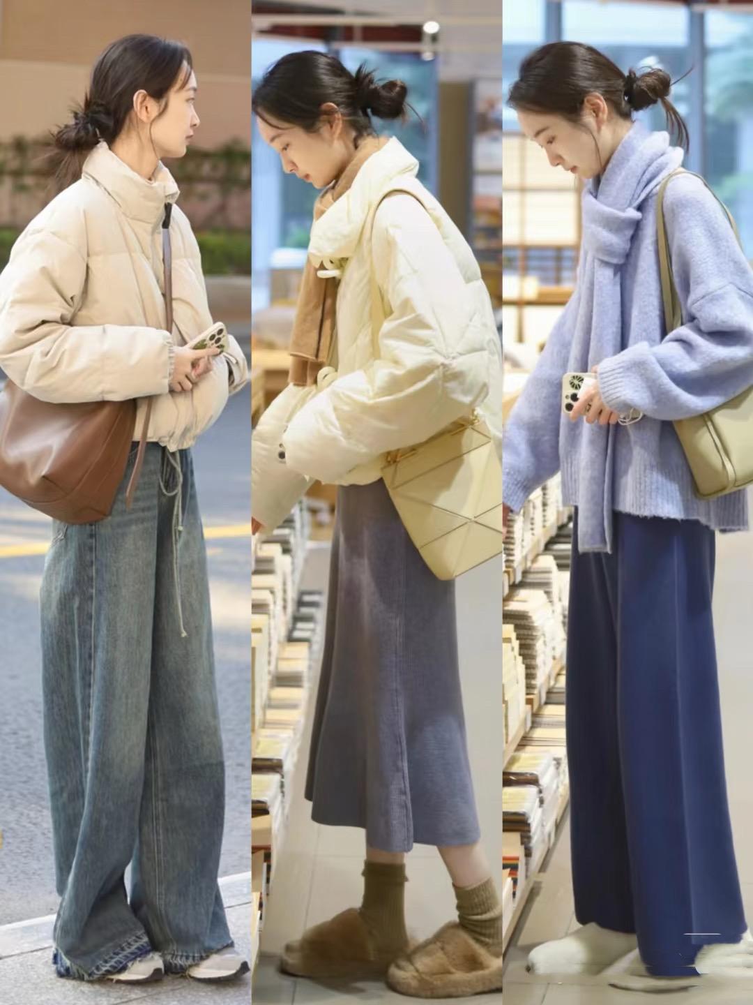 羽絨服+牛仔褲,雖然是一組比較基礎的搭配,但是通過溫和的色系,也可以打造出柔美氣質。