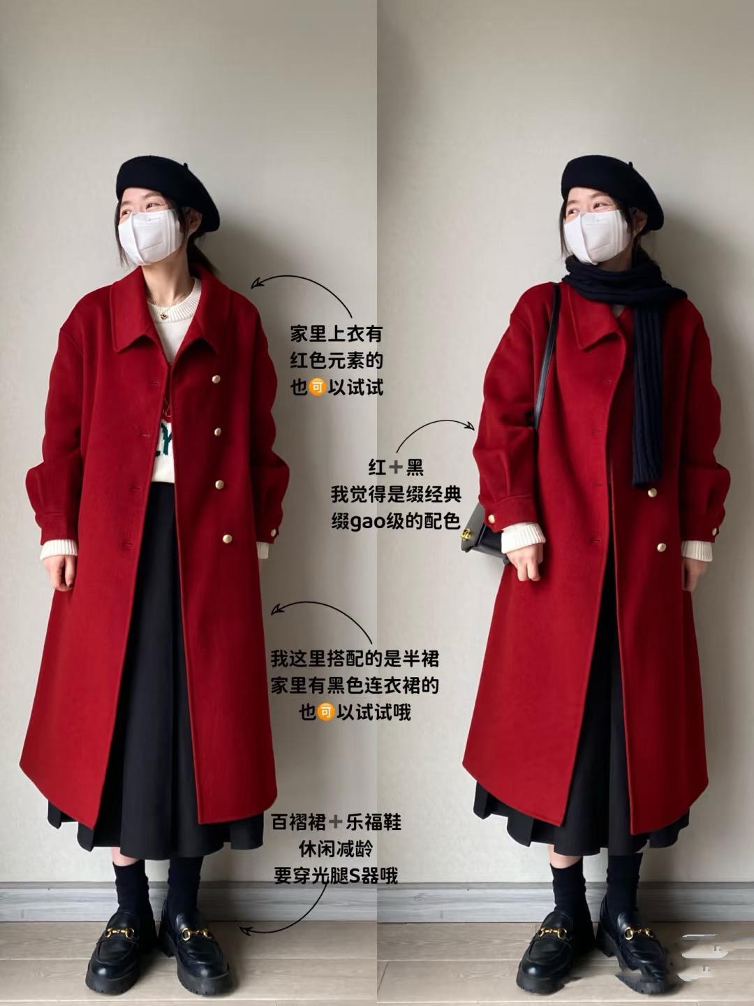 紅色+黑色,高級又不張揚。紅色呢大衣+黑色高領毛衣+黑色半身裙+黑色厚底樂福鞋,洋氣保暖又顯高,黑色半身裙大量感的款式,很顯溫柔也顯小腿纖細。