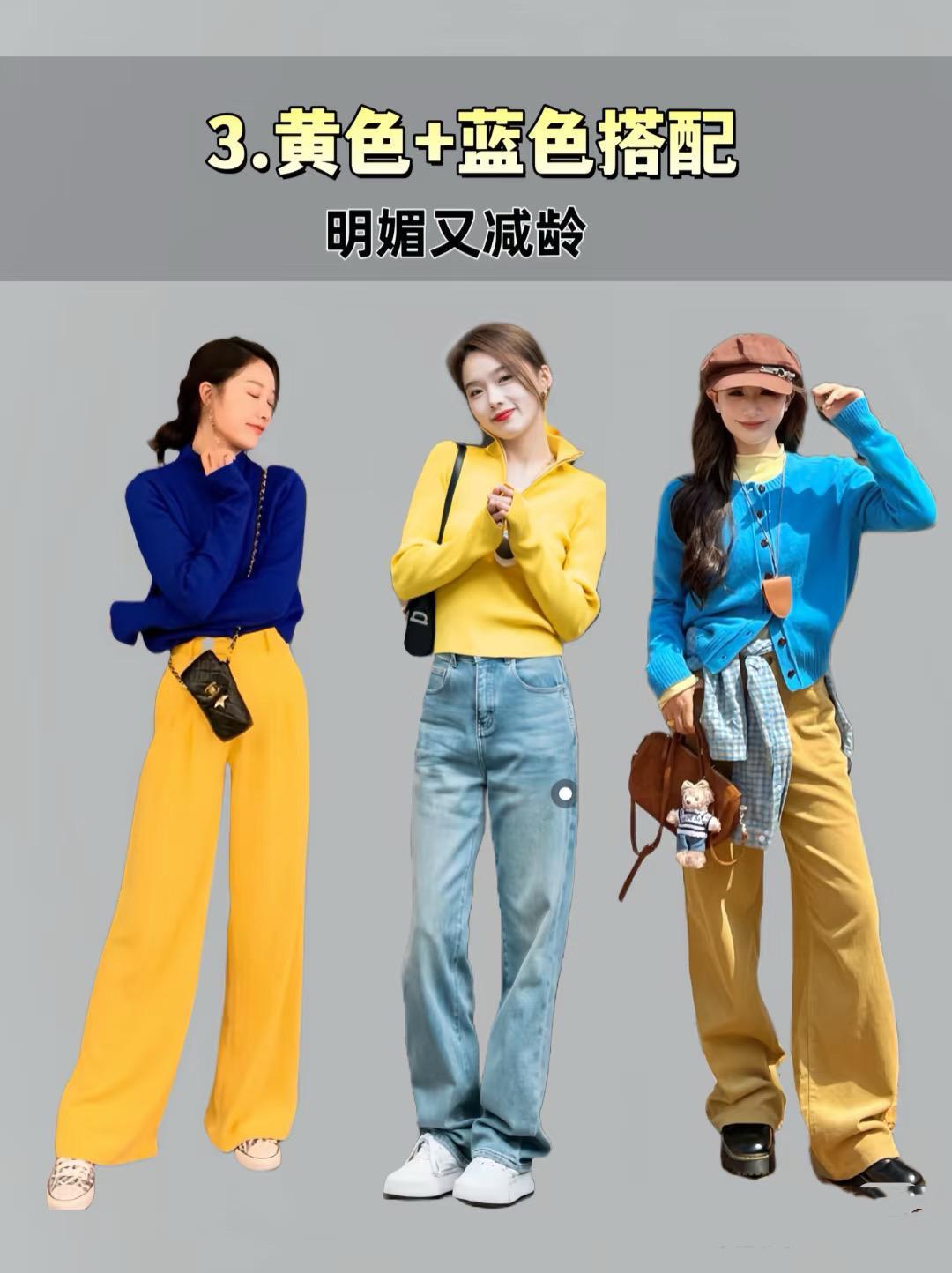 黃色系的毛衣、藍色系的牛仔褲。或者藍色系的毛衣、黃色系的高腰褲,都可以營造出這種俏皮又時尚的美。