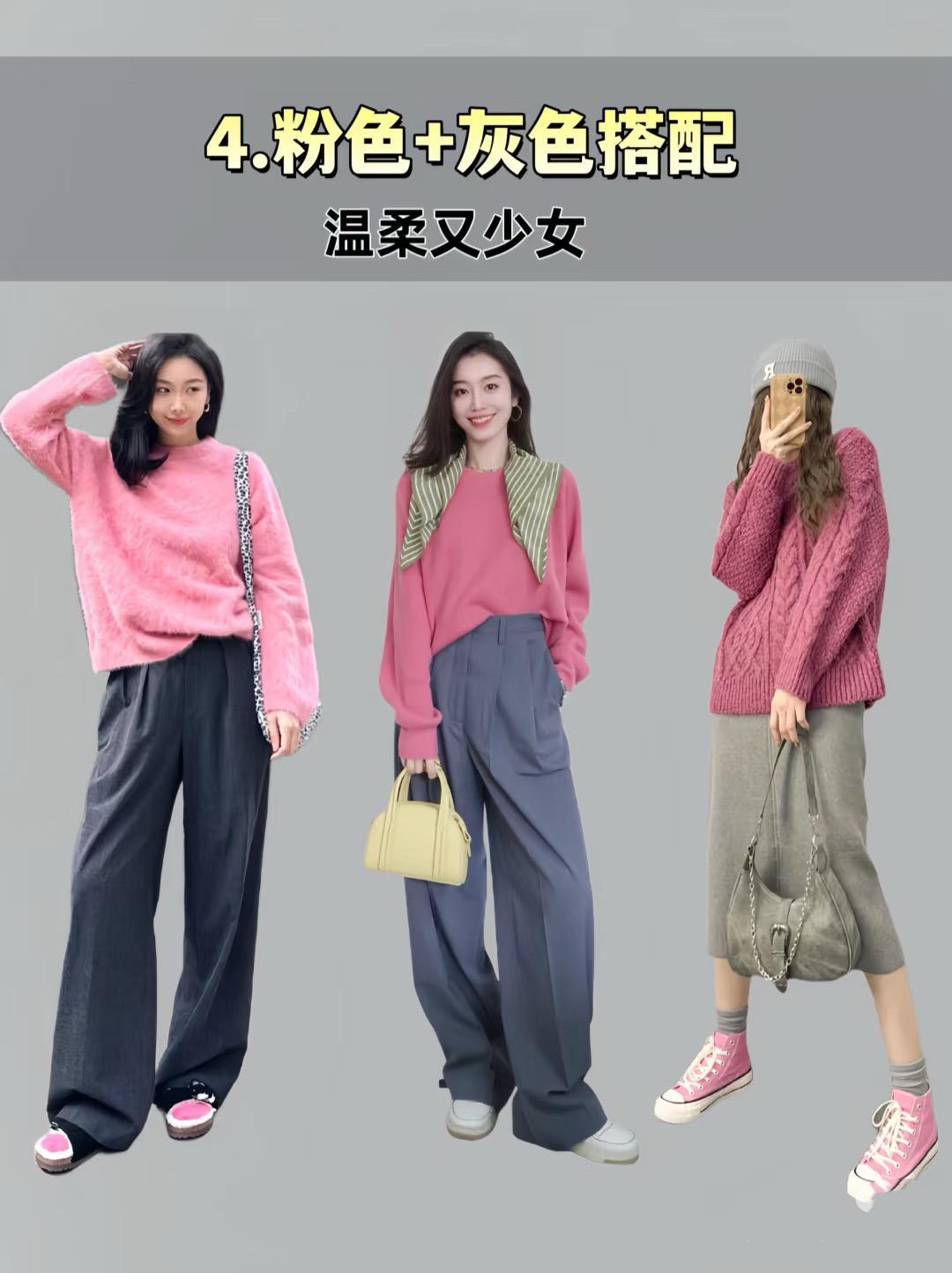 一種溫柔又大氣的少女風穿搭,誰能不喜歡呢?柔和的粉色毛衣,高級的灰色闊腿褲/半身裙,配在一起既有少女的溫柔、又特別的甜美。