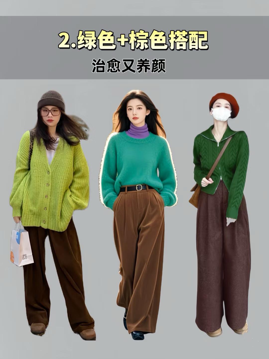 秋冬季節,一種很治癒又很耐看的美。這種高飽和度的綠色,配上美拉德風的棕色,太有秋冬季節的意境了。