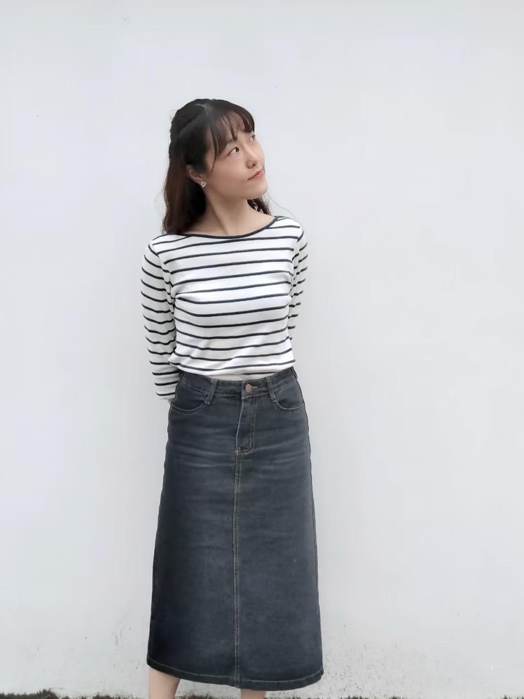 黑白條紋打底衫,可以直接配A字形的牛仔半身裙。上了年紀,有點腰粗、胯寬的小問題,這種牛仔半身裙,就可以很好的掩蓋,看這樣簡潔的搭配是不是也很顯年輕呢?