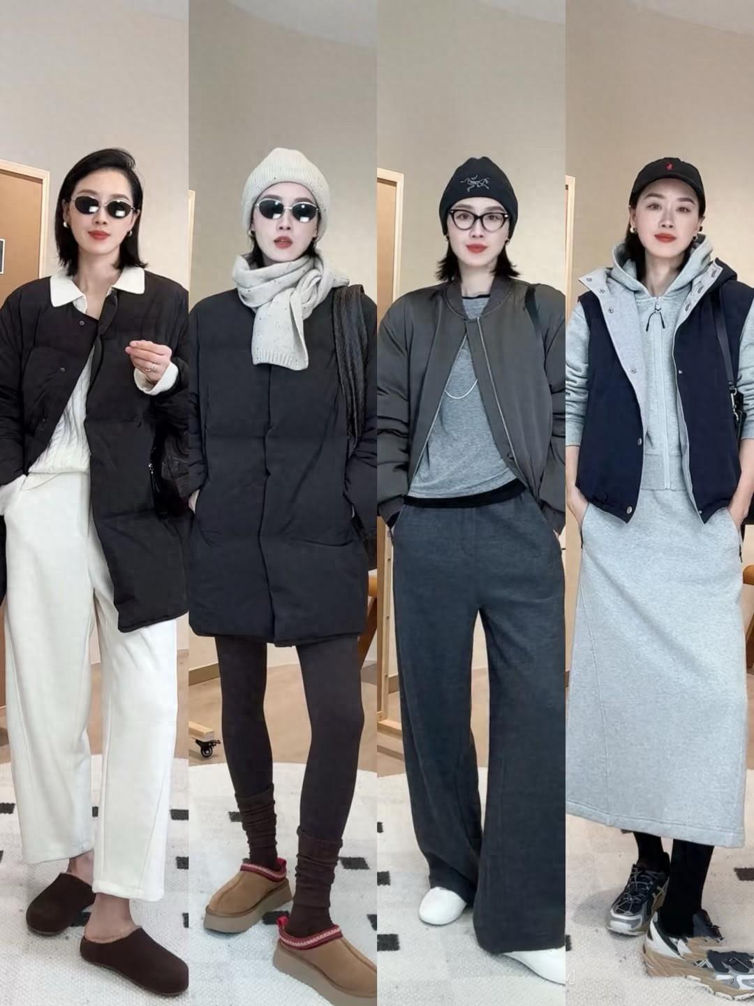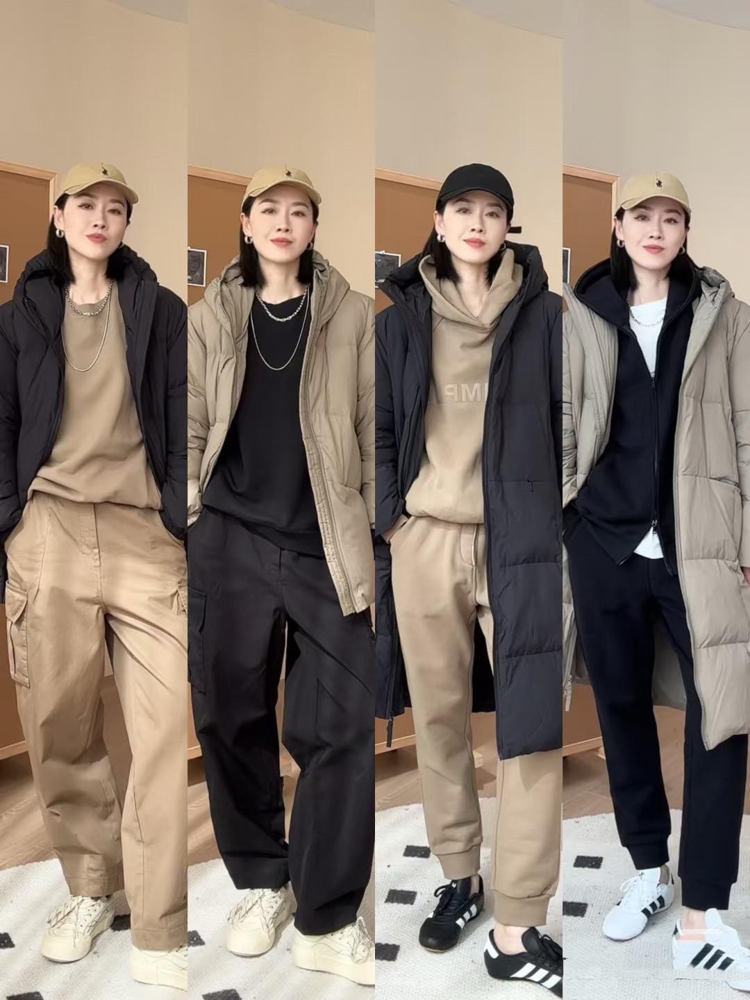連帽設計的衛衣套裝,寬鬆又舒適,搭配寬鬆羽絨服、自然是活力滿滿的。像這種寬鬆的羽絨服,可以配H行動剪裁,保暖又大氣。