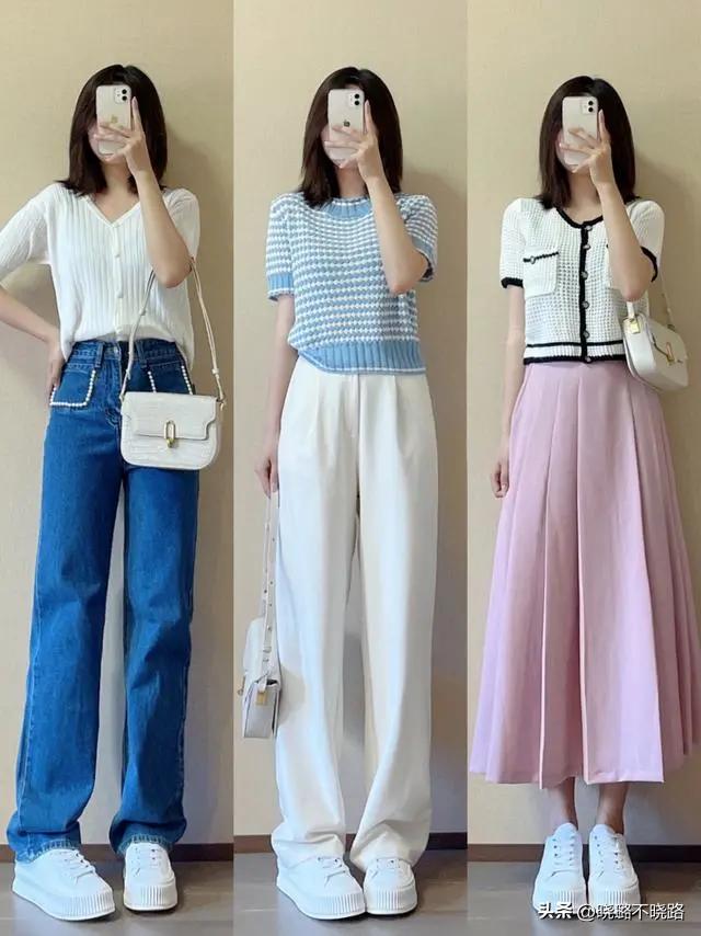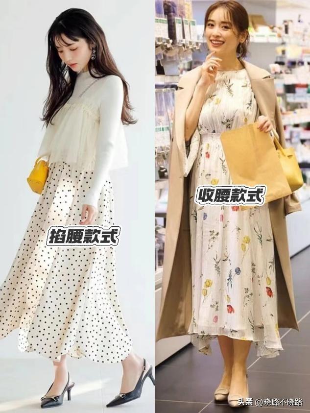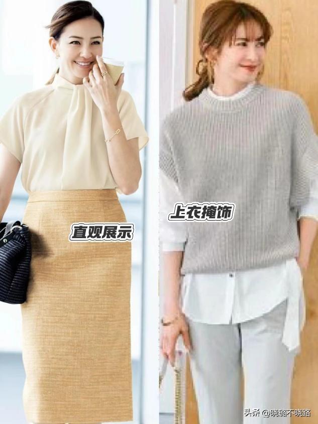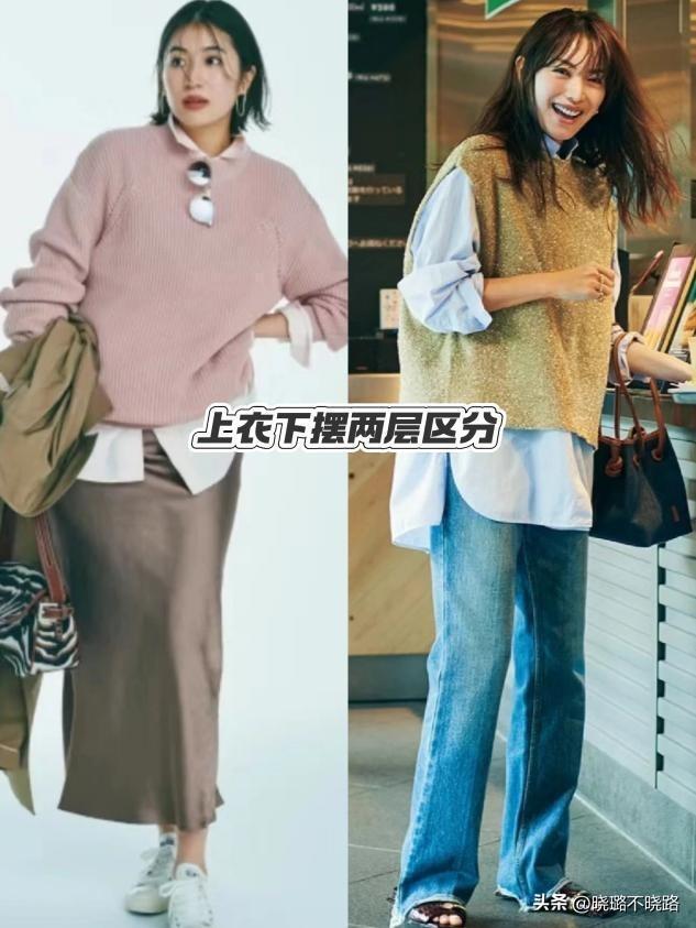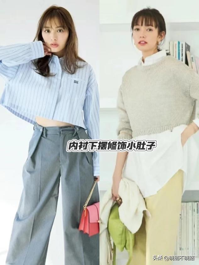 這種類似的穿法,有圖中這種直觀的卡衣角穿法,就是把你的上衣塞進你的裙子或者褲腰當中,另外一種就是有小肚子的女人可以利用上衣的層次穿搭,去稍微收斂一點展示出來的腰線位置,包容了小肚子,又很好的呈現出了上短下長的對比效果。