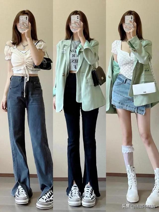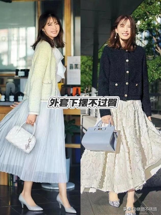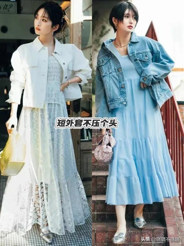 利用長裙搭配外套也是今年秋天比較火的一種穿法,超短款的外套選擇有西裝或者是牛仔外套,這一類外套千萬不要再收腰了,下載部分可以縱向向下垂,這樣去銜接你長裙的線條纔會有比較合適的寬窄輪廓對比,讓整套造型的視覺焦點全部放置在你收緊的腰線上面,腰臀的對比感會讓你形象很加分。