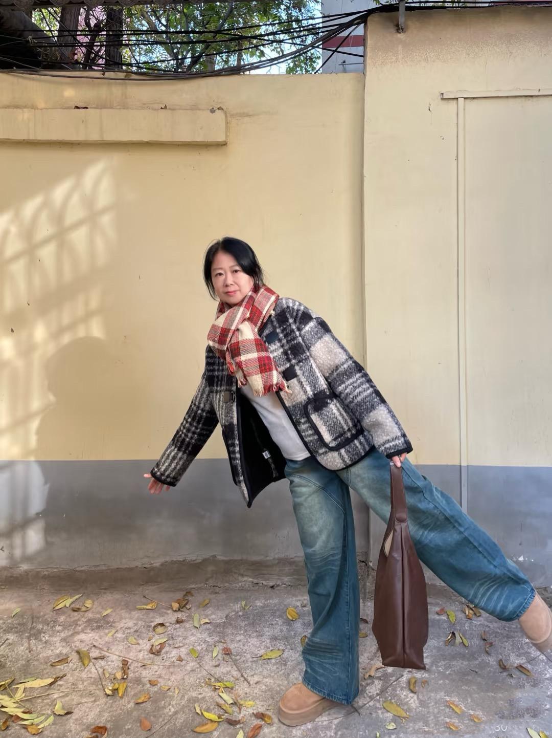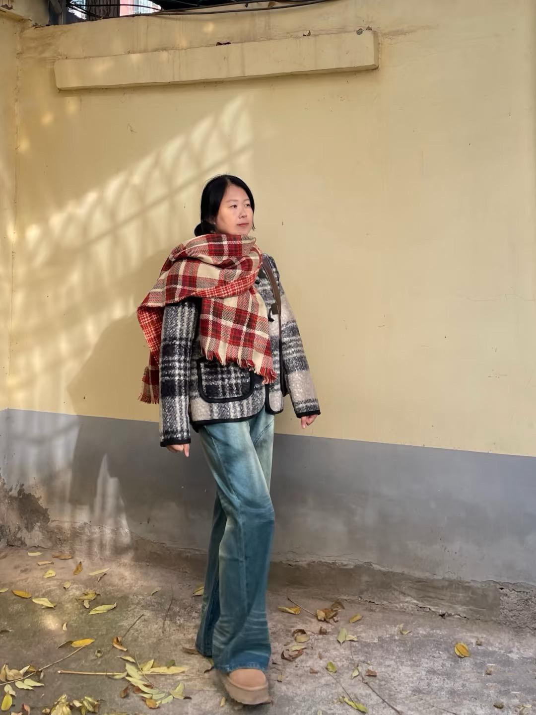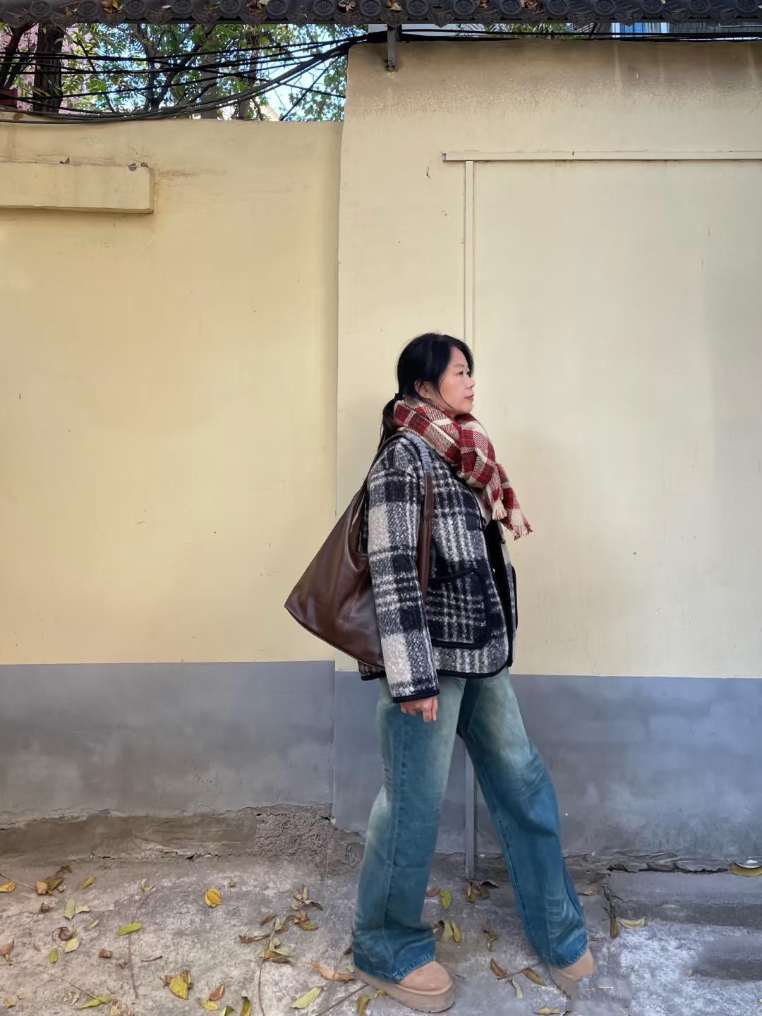 小廓形的格子外套,帶着年代感和復古氣息。搭配了同樣是格子圖案、卻不同色的圍巾、穿了一條復古藍的牛仔闊腿褲、踩了一雙厚底的學習靴。