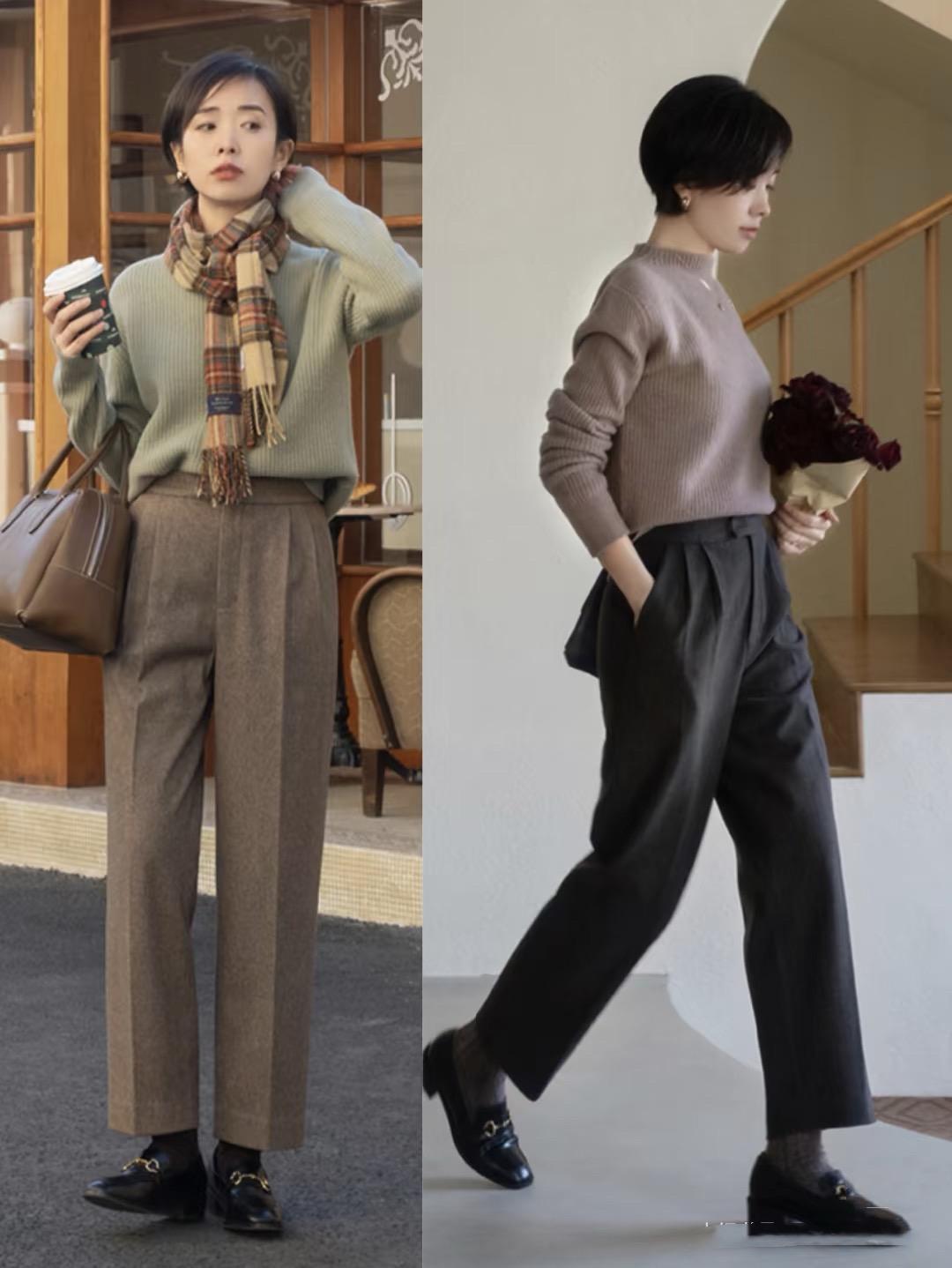 寬鬆的毛衣/打底衫,下襬塞進褲腰裏,很溫柔也更體面。這種下襬塞衣角的方式,不管哪個年紀都適用。大齡女性,儘量用寬鬆上衣,塞進腰腹部有一定放量的褲腰裏,才大方顯瘦。