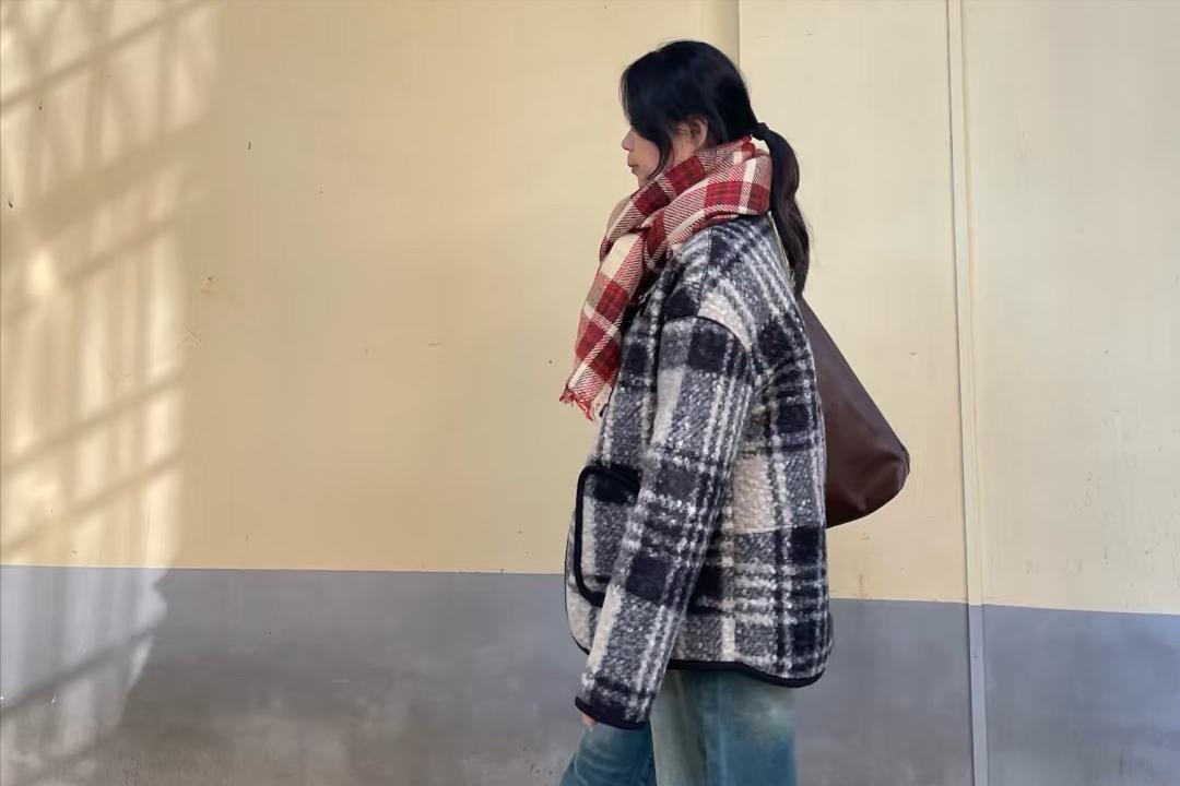 這格子的外套、配上格子的圍巾,清晰的撞色反而顯的有點臃腫。其實穿格子衣服,儘量搭配純色圍巾,纔不會顯得花哨凌亂。