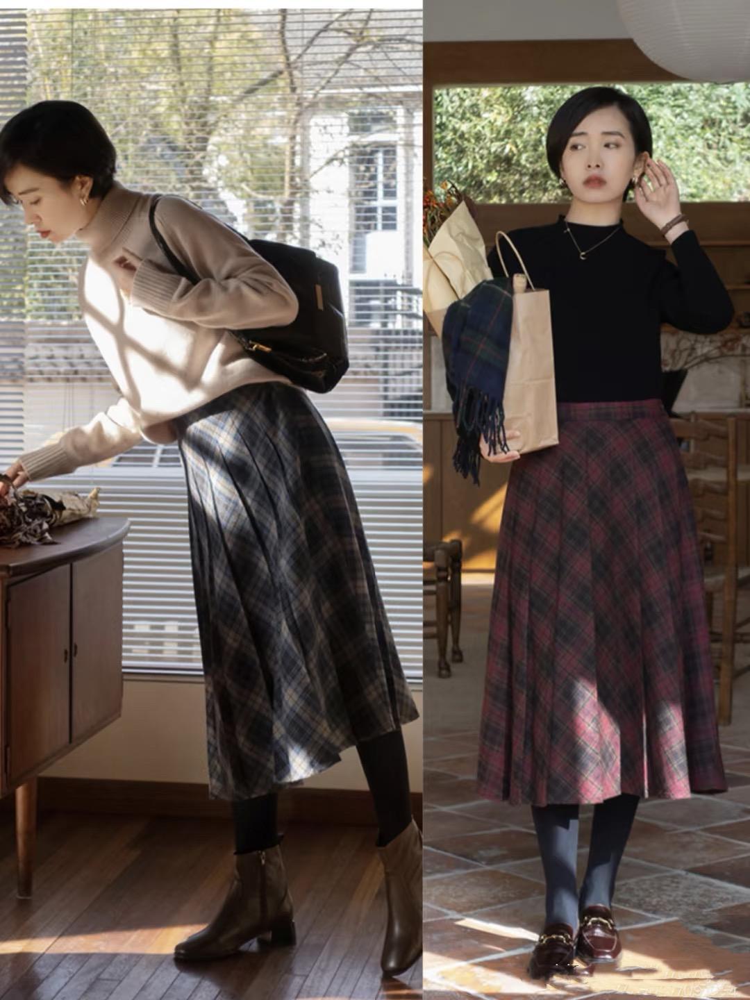 純色打底衫配格子半身裙,文藝又復古。大齡女性選擇柔和的色系,很顯年輕又有腔調。純色打底衫+格子半身裙,穿起來好顯氣質。