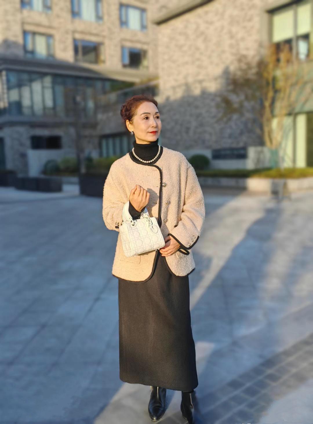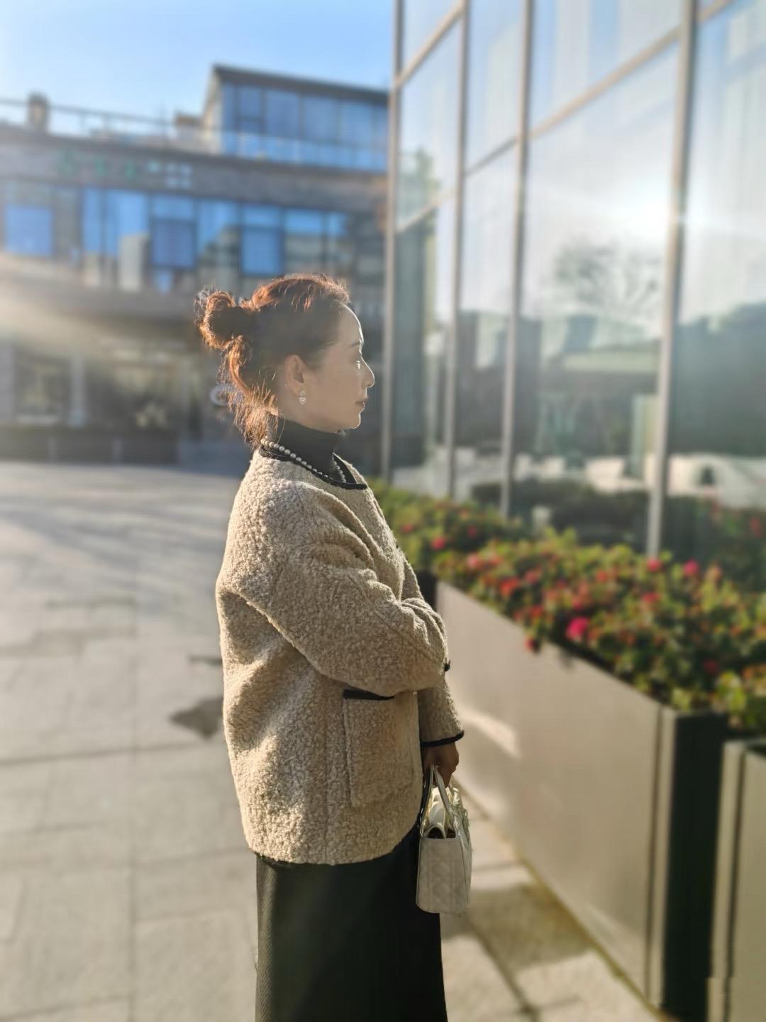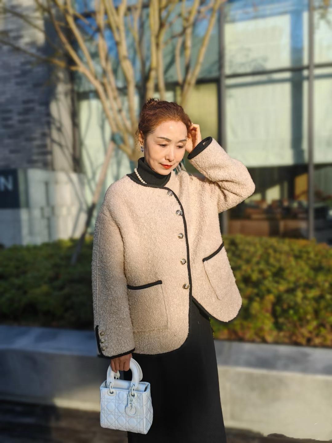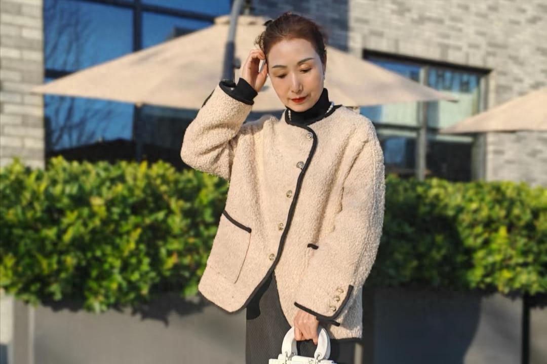 小香風外套寬鬆版型、羊羔絨設計,保暖防風,初冬季節穿起來也很溫暖。穿着小香風外套的時候,阿姨挽起了長髮,扎一個丸子清爽減齡又顯氣質。